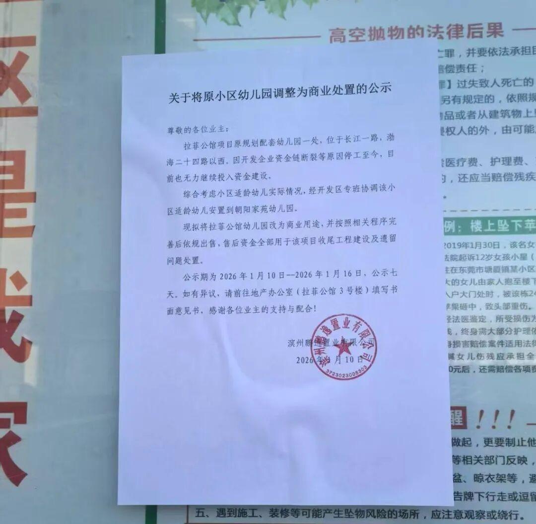 滨州又2家开发商欲变更幼儿园用途 继沾化金城国际、滨城华硕天韵等小区后,山东滨州开发区拉菲公馆、恒大小区开发商公示,拟将因资金链断裂烂尾的配套幼儿园改为商业用途,售后资金用于项目收尾及遗留问题处置,公示期为2026年1月10日至16日。 该小区适龄幼儿已安置至其他幼儿园,而此类变更与《山东省学前教育条例》中配套幼儿园严禁擅自改用途的要求相悖,需在监管与政策创新中平衡公共利益与市场秩序。 来源 看滨州