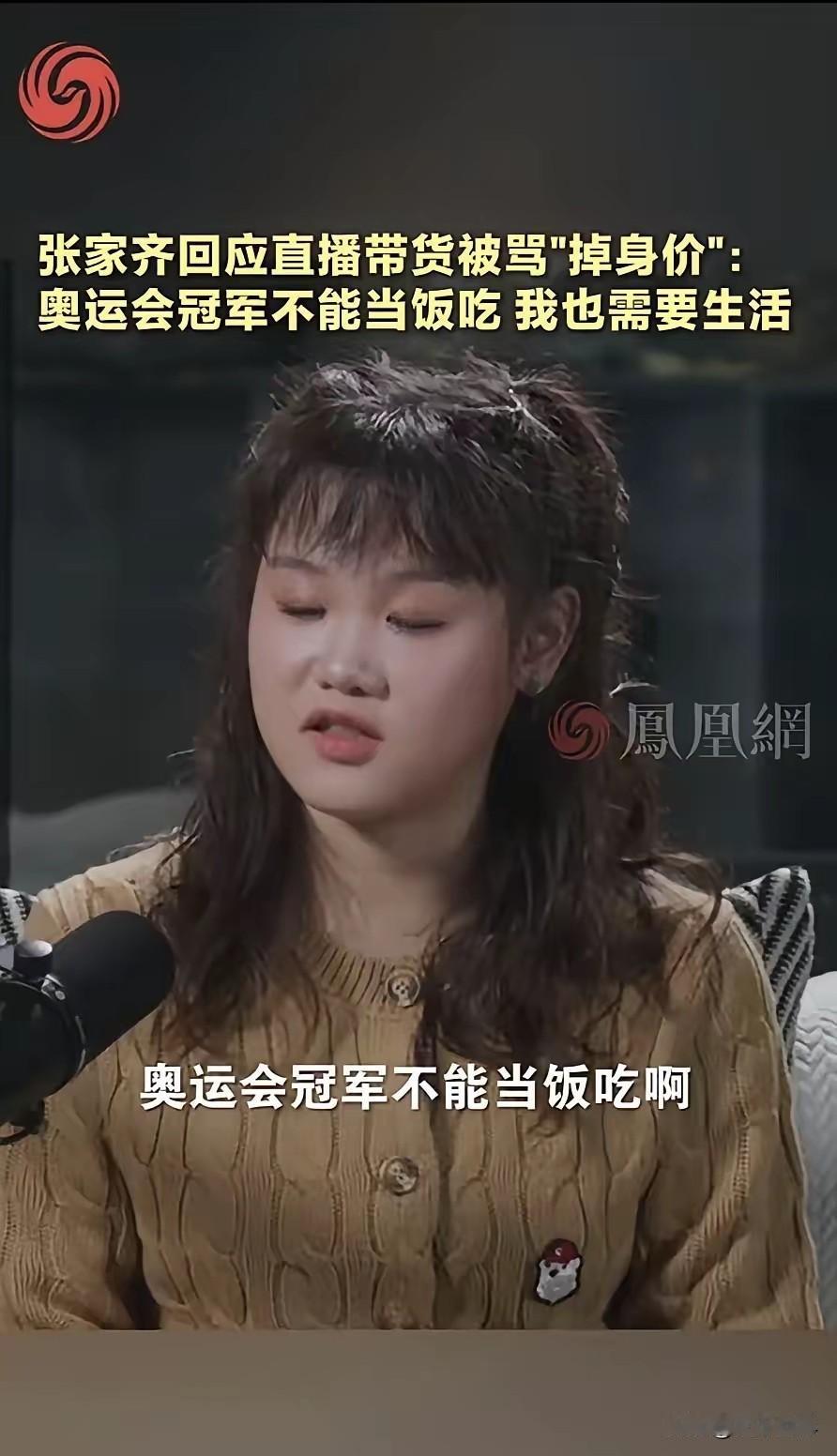 张家齐终于发怒了! 她说,我接受大家的批评,但是,我也需要吃饭呀,我不能告诉别人,我是奥运冠军,别人就给我饭吃呀? 这句怒吼里藏着太多委屈,听着让人心酸又无奈。 张家齐是谁,是站在奥运最高领奖台上的跳水冠军,是为国争光的运动健儿,可褪去冠军光环,她也是个要为柴米油盐奔波的普通人,要吃饭要生活,这些最基本的需求,从来不会因为一块奥运金牌就自动兑现。 网上总有人对退役运动员的选择指手画脚,觉得奥运冠军就该端着所谓的体面,不该踏入直播带货这类领域,可这些人忘了,运动员的运动生涯本就短暂,跳水项目更是吃青春饭,常年高强度训练留下一身伤病,退役后要重新适应社会,找条能安身立命的路,哪有那么容易。 他们在训练场熬过无数个日夜,为了一个动作反复打磨千百遍,为了保持状态严格控制饮食作息,拿冠军的背后是常人难以想象的付出,可退役后,曾经的荣光不能当饭吃,专业技能在普通职场也未必能用得上,直播带货也好,转型其他行业也罢,不过是靠着自己的努力挣口踏实饭,凭什么要被苛责。 总有人把奥运冠军神化,觉得他们就该活在聚光灯下,就该永远光鲜亮丽,却忽略了他们也是血肉之躯,也要面对生活的琐碎和压力。 张家齐说要吃饭,这话实在又扎心,戳破了那些不切实际的幻想,运动员不是不食人间烟火的偶像,他们的努力值得被尊重,他们为生活打拼的样子,更不该被指责。 我们该敬佩的,从来不是冠军头上的光环,而是他们为梦想拼搏的韧劲,更该理解的,是他们褪去光环后,努力生活的勇气。 靠自己的双手吃饭,堂堂正正干干净净,哪怕是奥运冠军,这样的选择也无可厚非,不该被说三道四。 各位读者你们怎么看?欢迎在评论区讨论。