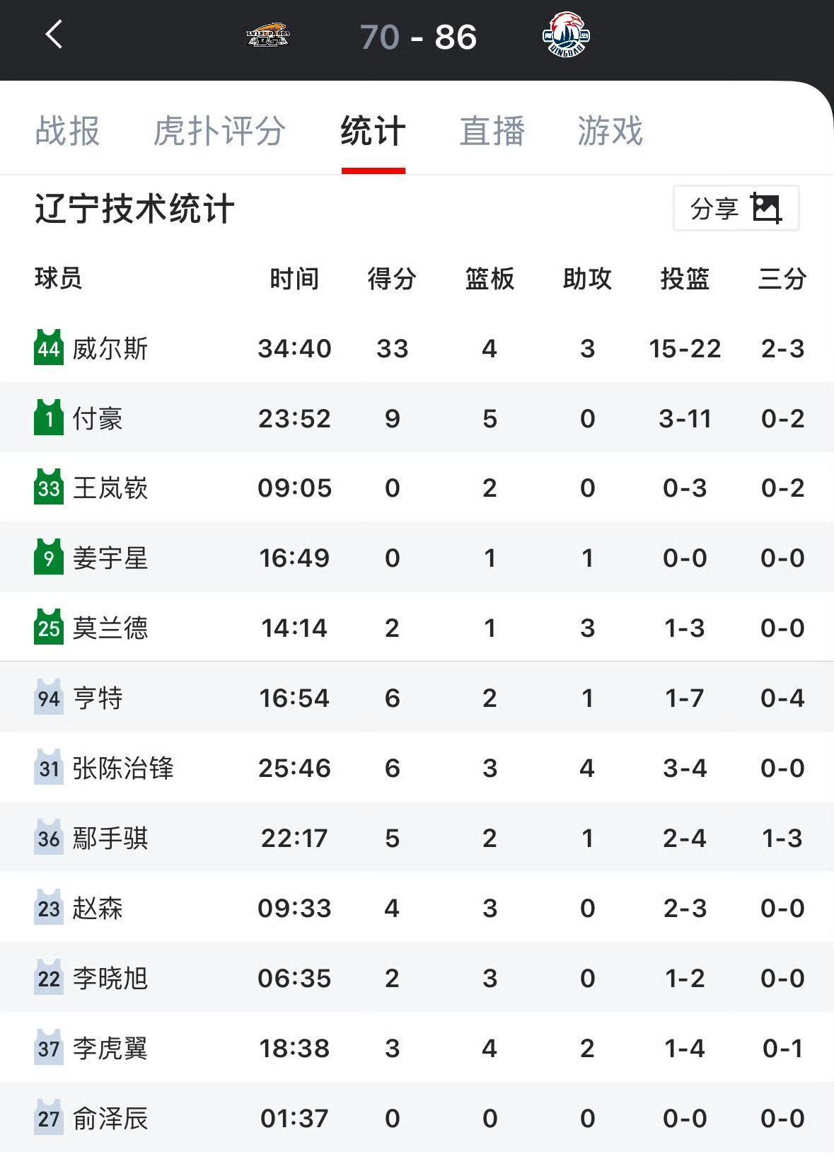 昨晚球场上有点尴尬,作为老球迷我跟几个人一席谈都有点说不下去。辽宁刚被广东掀了30分,今晚主场又输给青岛16分,主场两连败,场面看着真难受。 比分之外更刺眼的,是那种压抑的氛围。比赛一结束,队里在场边互相鼓劲时,威尔斯裹着毛巾自己转身进了更衣室,那一瞬间像是把队内矛盾当众摊开了。 更扎心的是数据:全队只有70分,威尔斯一个人拿了33分,明显是他在硬扛。队友没能站出来分担,配合和攻防化学反应看起来出了问题,换谁都会心里不是滋味。 说白了,输球能接受,连败还在主场,而且内部看似有裂痕,球迷真的揪心。你们觉得这是战术问题、化学反应断裂,还是球员心态出了岔子?辽宁该怎么解决才不会越打越糟?欢迎聊聊你们的想法。