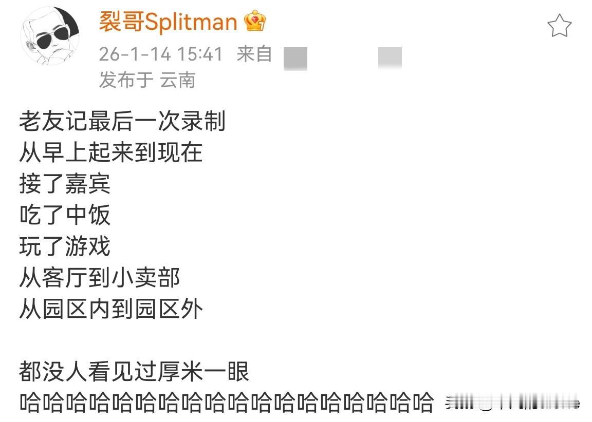 1月14日,苏醒用小号发文说道:“老友记最后一次录制,从早上起来到现在,接了嘉宾