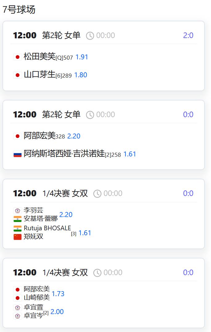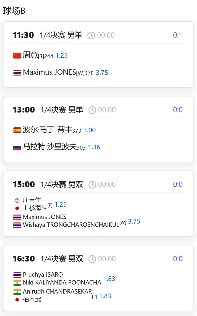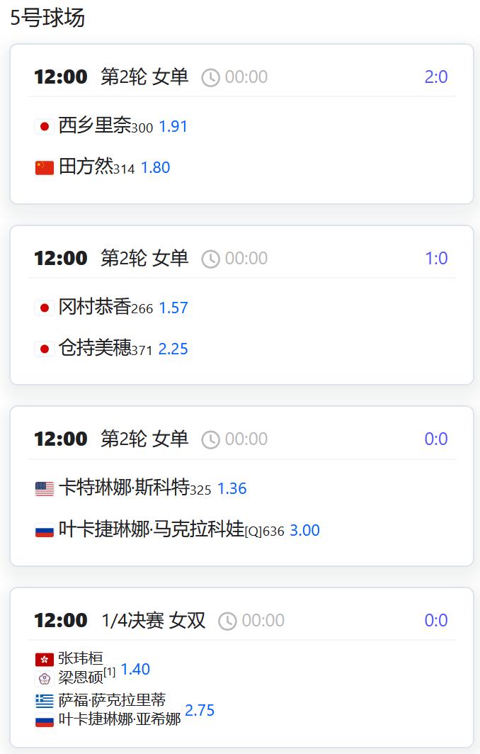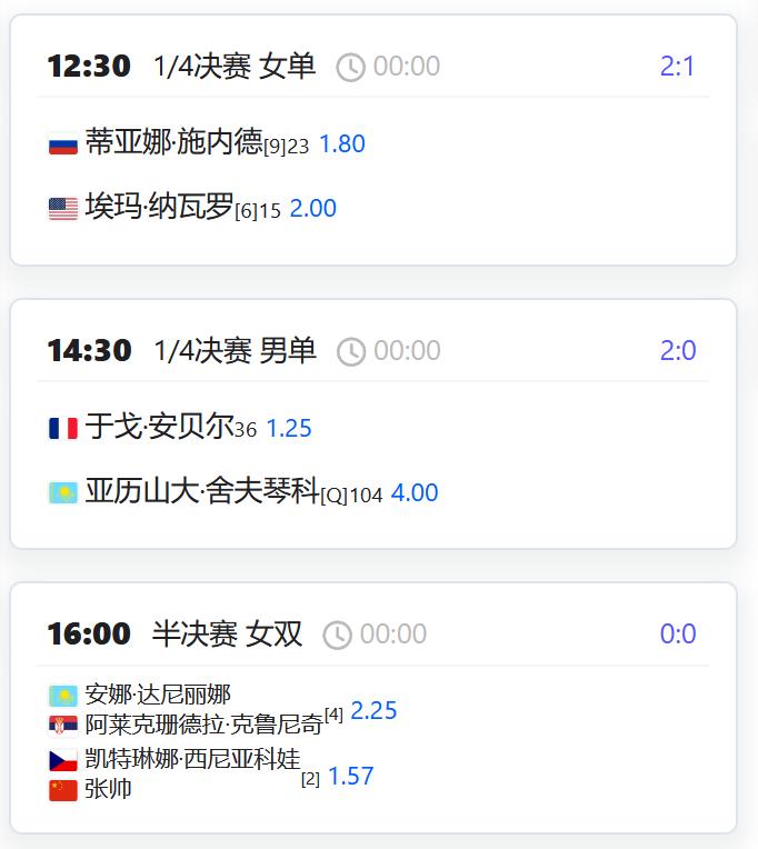 2026澳大利亚网球公开赛,资格赛决赛轮: 吴易昺将在6号球场第二场与美国球员博耶争夺一个正赛席位; 朱琳将在13号球场第二场与17号种子什塔库西奇争夺一个正赛席位; 白卓璇将在16号球场第二场与韦德曼诺娃争夺一个正赛席位; 袁悦将在17号球场第二场与前法网四强齐丹谢克争夺一个正赛席位; WTA500赛阿德莱德站,张帅/西尼亚科娃将与达尼丽娜/克鲁尼奇争夺一个女双决赛席位; CH75暖武里府,周意将与本土外卡球员争夺一个男单四强席位; W75暖武里府,田方然将与西乡里奈争夺一个女单八强席位; 女双四分之一决赛,郑妩双组合将与李羽芸/蕾娜争夺一个女双四强席位。