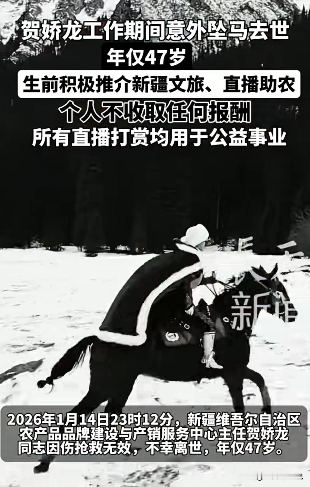 这真的是太让人泪目了,这么好的一个人竟然因为意外去世了。 1月14日晚,贺娇龙不幸去世,年仅47岁。 值得一提的是,她生前积极推介新疆文旅、直播助农,而且个人不收取任何报酬,所有直播打赏均用于公益事业。 这是多么伟大和无私的一个人,真的是太难得太了不起。 对于她的不幸去世,真的太让人感到痛心了。[流泪]