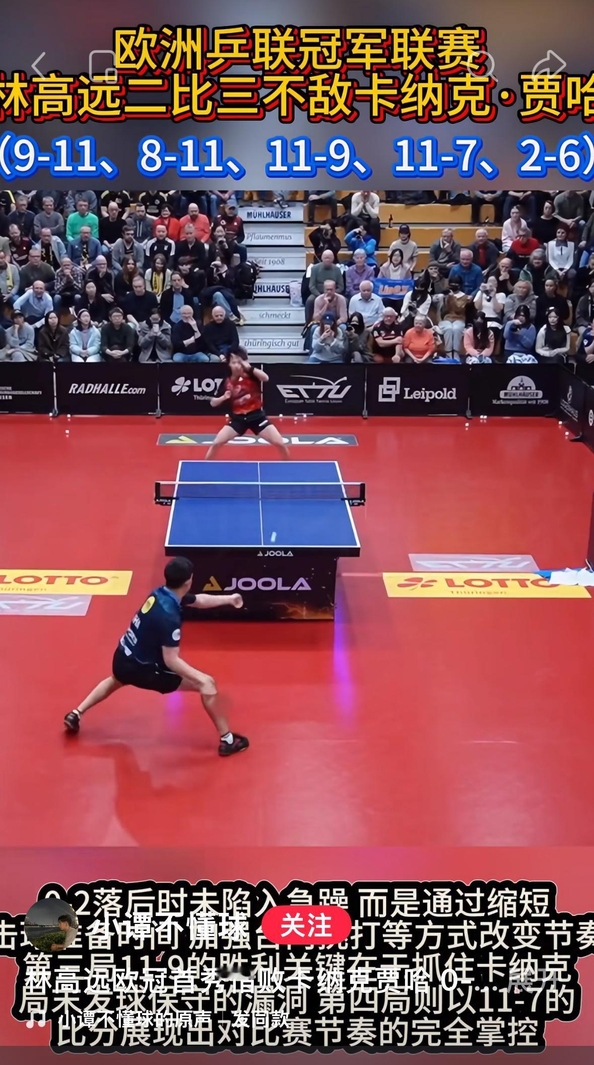 林高远谈欧冠首秀输球原因:比赛场馆比较小,球速比较快! 一月15日凌晨一点, 林高远欧冠8强首回合, 穆尔豪森0:3杜塞尔多夫, 林高远2:3贾哈, 赛后林高远谈首战感受: “这次比赛还是非常不一样吧, 说实话, 比赛场馆比较小, 然后整个球速也非常的快, 可能观众也好, 各方面都离球台比较近, 人也比较多, 所以说跟国内比赛感觉不一样, 比赛的感觉跟那种大馆的感觉完全不同,也需要自己在这方面做出一些 调整”! 林高远整场比赛打得非常积极, 只是前两局在关键分处理上 有一些保守, 对场地的不适应, 特别是决胜局抢六分赛制, 德甲也是 大比分2:2决胜局谁先拿下6分, 谁会胜! 林高远总结经验再出发🛫……
