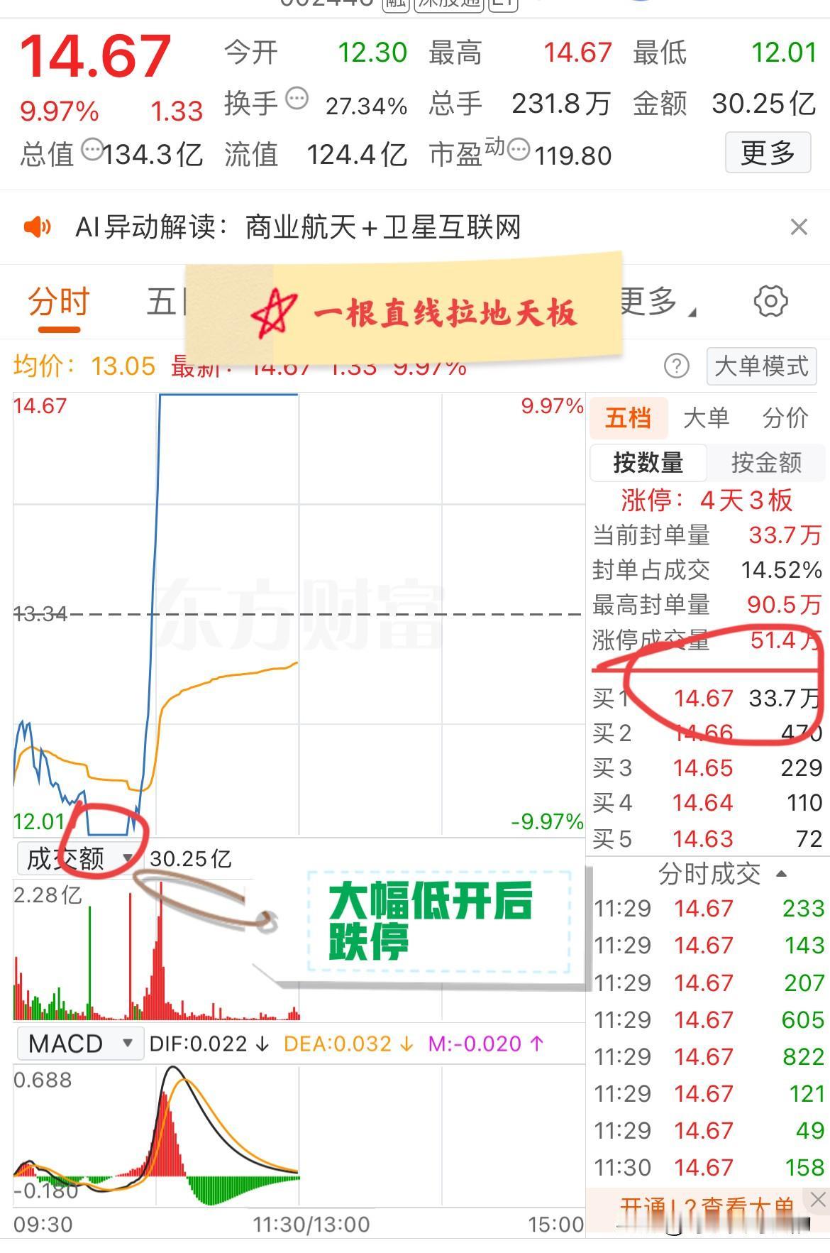 大A今天最强的票已经提前诞生了!低开7.8%后跌停,跌停15分钟后又拉涨停! 该票最近被挖掘出商业航天概念,由此近期表现非常强势,昨天也是以涨停收盘!但因为市场降温的原因,商业航天和AI应用今天都大幅低开,该票也是低开7.8%! 开盘后该票一度向上拉升,可惜后劲不足便又不断回落。10点钟该票开始加速下跌,两分钟后就封上了跌停板,封单高达28万手! 出人意料的是跌停封了也就15分钟,就有连续数万手的买单前来撬板。很快跌停板即被打开,该票由此被快速拉起。 在跌停板附近犹豫了一会儿后资金再度发力,该票随即如火箭升空一般直冲云霄,10分钟后该票已经成功封上涨停,截至午间收盘涨停板依然封的非常稳! 而与该票同期被挖掘的海某格和东方某信则是仍在跌停板上稳稳的躺着,而且都是巨量封单,相比较来看该票却完成了地天板,真的是太强了! 但是这种票大家也不用太羡慕,毕竟这只是少数人才能碰到的机遇,至于参与那就更是不要搞了,毕竟风险还是太大了!