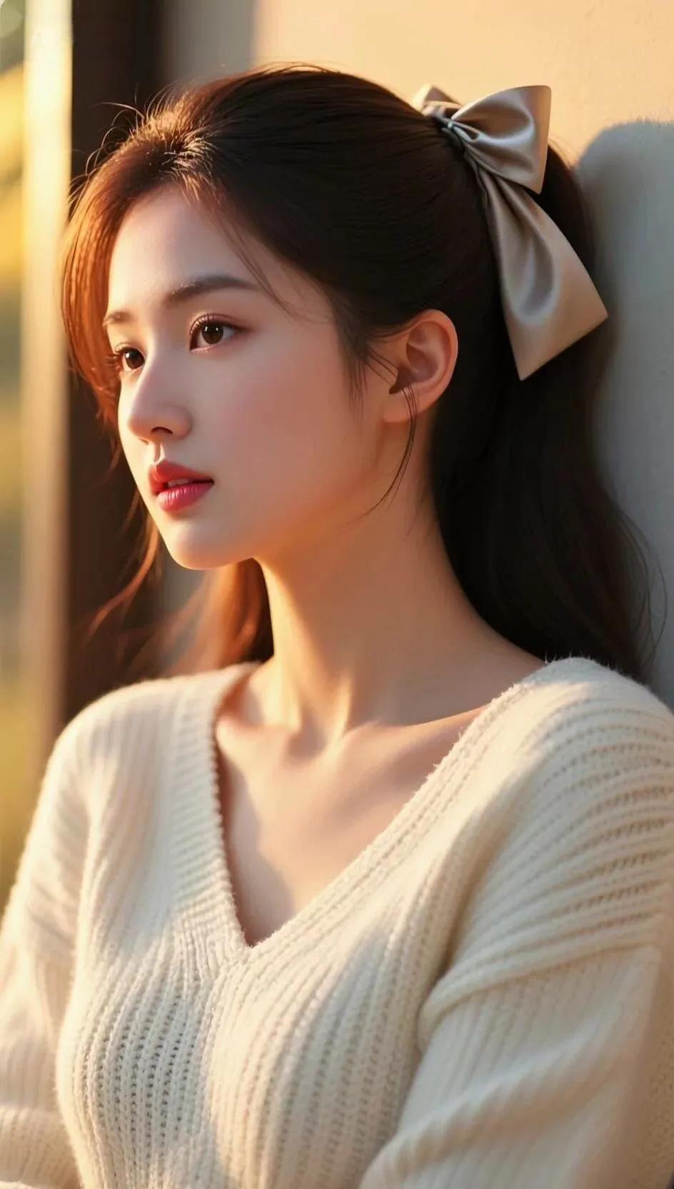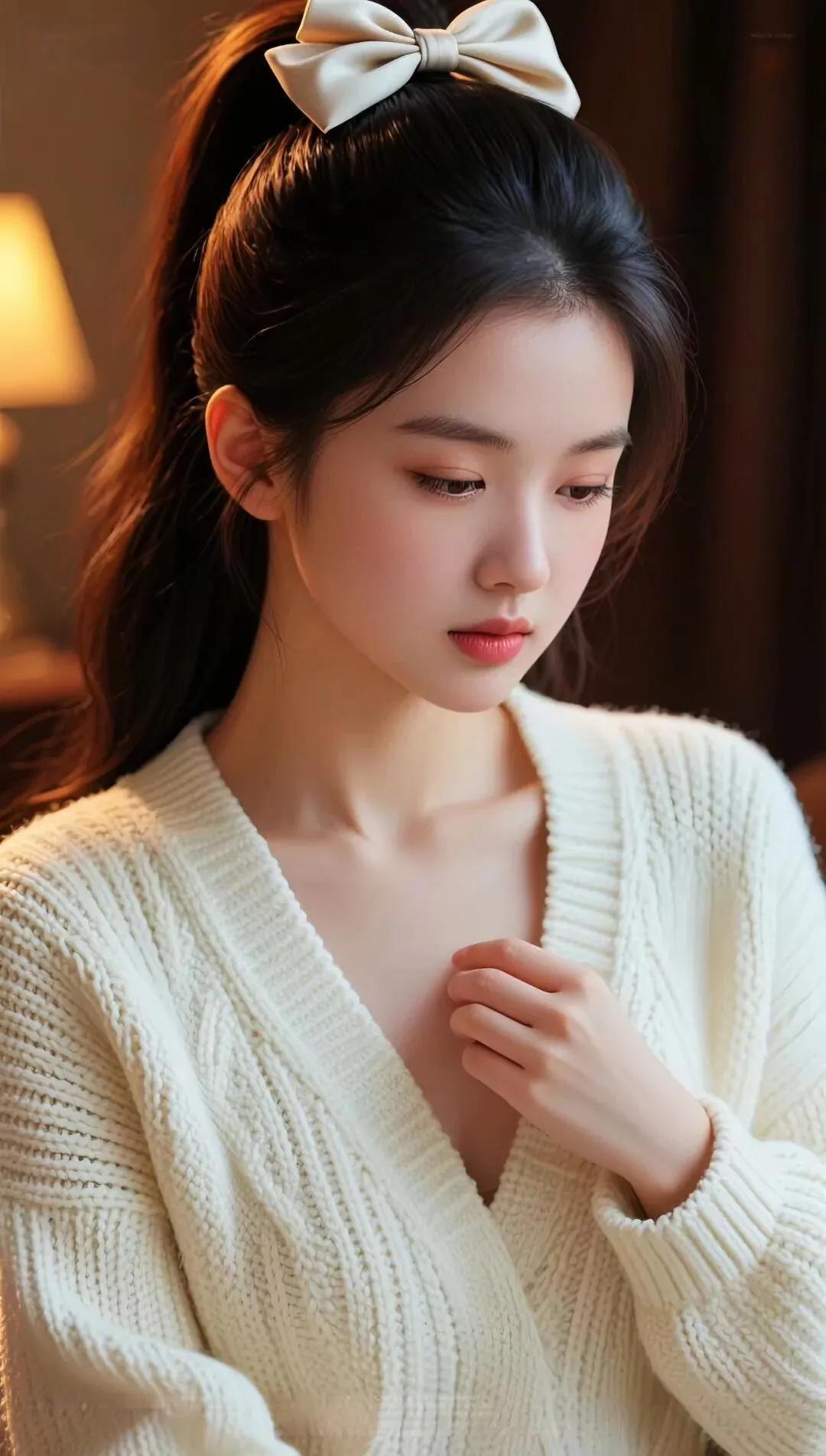 温柔甜美的少女,白色毛衣搭配蝴蝶结发饰,散发着冬日暖阳的气息。