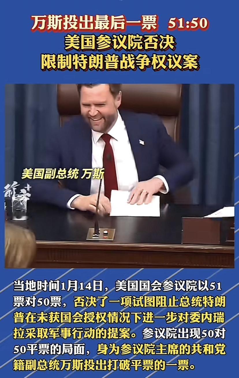 万斯投出关键一票! 美国参议院提出限制特朗普战争权的议案,在美国参议院出现了50票赞成,50票反对的情况,万斯在关键的时候投出了反对票,意味着美国两院也没有办法限制特朗普。 这意味着特朗普可以在未经国会授权的情况下,进一步对委内瑞拉采取军事行动。这时候美国的三权分立就变成了笑话,特朗普掌握了真正的权力,美国国会的作用被大幅度削弱。 各位是怎么看的?欢迎评论区留言。