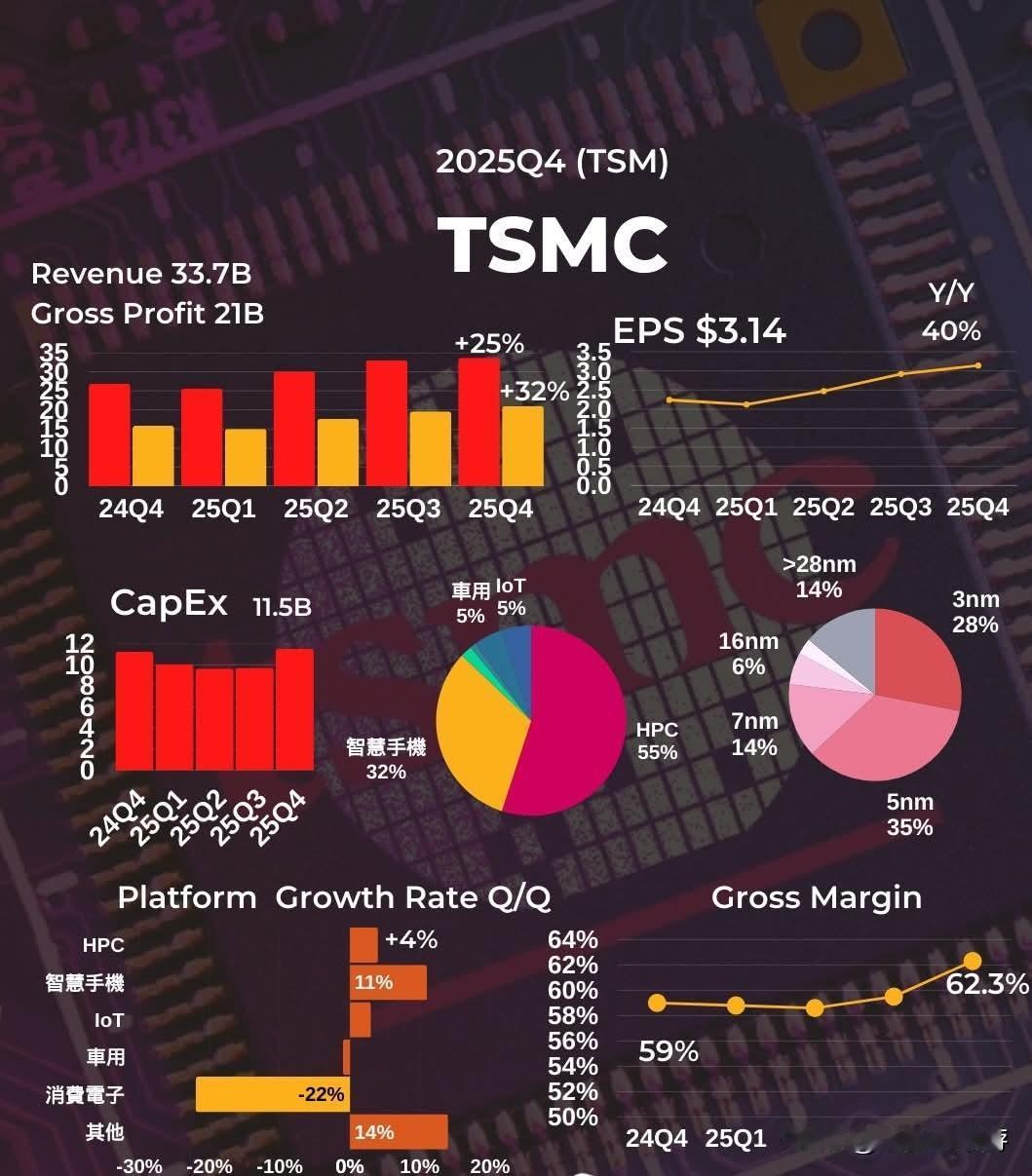 台积电第四季度营收同比增长25%至337亿美元,毛利提升32%至210亿美元,毛