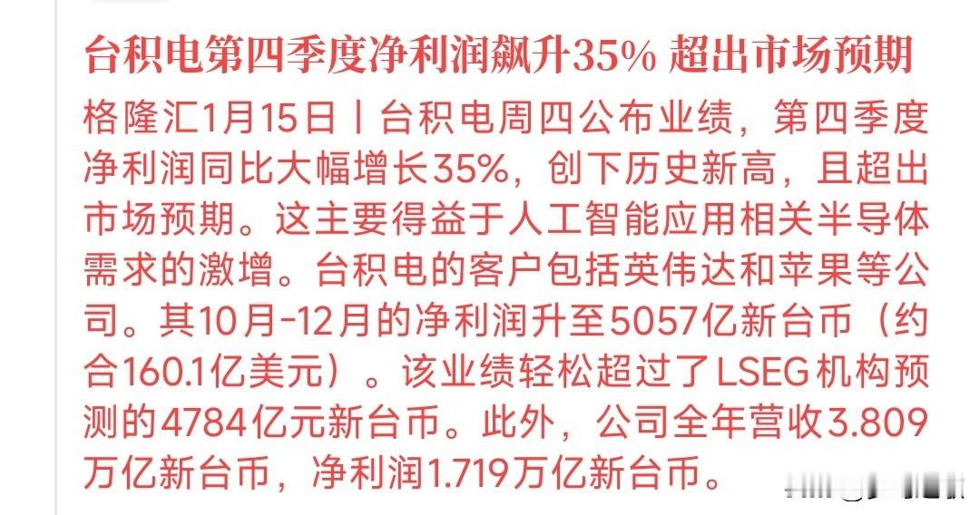 半导体盘中利好发布,板块直线拉升 今天台积电发布了四季度业绩,净利润飙升35%,这是非常炸裂的业绩。第四季度净利润5,057亿元台币,预估4,670亿元台币。完全超出了市场的预期。 消息发出后,半导体板块直接从下跌1%拉升到了上涨1%。存储芯片更是大涨。 虽然半导体板块拉升,但是大盘指数并没有什么变化,主要就是大资金压盘大蓝筹和权重个股,目前个股还是涨少跌多。 从现在的表现看目前A股市场是降温了,成交量在飞速的下降,预计今天2.7万亿的成交量都有点难。