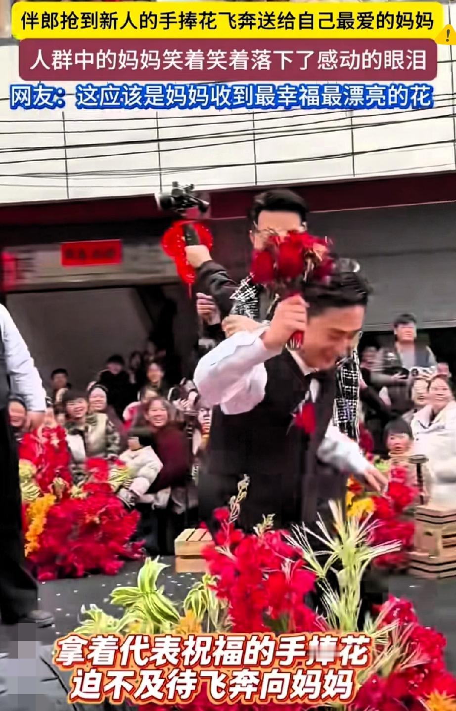贵州这场婚礼的捧花,直接把幸福的意义重新定义了! 大家默认捧花是未婚者的“脱单锦鲤”,挤破头都想抢,可这位伴郎接住后,一句“老妈你在哪”直接让全场破防。 他没把好运留给自己,反而捧着花大步走向母亲,说最该被祝福的是辛苦养他长大的妈妈。 这一幕戳中了多少人的心? 现在的婚礼满是爱情的甜蜜,却常常让操劳半生的父母成了背景板。 父母要的从不是贵重礼物,而是被子女放在心上的重视,是在重要场合里不被忽略的存在感。 伴郎这波操作哪里是送捧花,分明是把藏在心里的感恩当众说出来。 比起敷衍的问候,这种明目张胆的偏爱,才是父母最想要的幸福。 你在重要时刻,会用什么方式向爸妈表达心意呢?