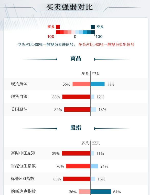 特朗普暗示暂缓对伊朗采取行动, 油价尾盘大跌,今日延续疲态。 当前WTI原油现卖出信号。 贵金属早盘全线下挫, 地缘局势缓和削弱避险需求, 后市金融市场的市场情绪如何? 通过下图,可以明显看出: 黄金多头比例为56%,空头比例为44%; 白银的多头比例为88%,空头比例为12%, 超过80%的重要分界线!