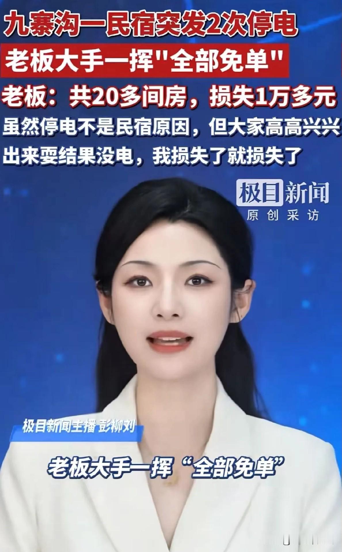 这家民宿老板火了!元旦,男子一家去九寨沟旅游,花500多定了一家民宿,结果晚上民宿停电了。 就在男子郁闷不已,想让民宿老板打个折的时候,老板的一句话让他惊呆了!男子:“见过坐地起价的,没见过主动免单的!” 发帖的赵先生是成都的上班族,平时难得有空陪家人出游,元旦特意带着父母和孩子打卡九寨沟,提前半个月就订好了这家名为满庭芳私汤别院的民宿。 下午抵达时就遇到停电,老板郎先生带着歉意请他们先去餐厅用餐,承诺电力很快恢复,没想到晚饭过后刚来电,晚上准备洗漱时又突然黑了下来。 孩子吓得哭闹起来,老人怕冷裹紧了外套,手机电量也所剩无几,赵先生心里直犯嘀咕,想着就算不打折,至少得有个说法。 他刚拨通老板电话,对方已经带着蜡烛和手电筒出现在门口。“实在对不住,今天这突发停电太少见了,肯定扫了你们的兴”,郎先生一边帮着点亮蜡烛,一边直接说道,“明天一早你去前台退单,1号的房费全免”。 赵先生愣在原地,连说“不用不用,打折就行”,郎先生却摆了摆手,“停电不是你们的问题,出来旅游图的就是开心,我不能让大家带着遗憾回去”。 后来才知道,当天民宿20多间房全住满了,郎先生这一免单,直接损失了一万多元。 郎先生在九寨沟做民宿已经五年,彭丰村的乡亲们都知道他实在。他常说,做民宿不是一锤子买卖,游客口口相传的口碑比什么都重要。 这次停电是小范围突发情况,电力部门排查后说是临时线路故障,并非民宿自身问题,但他觉得,游客住进来,体验感就该由自己负责。 有熟客透露,之前有游客把贵重物品落在房间,郎先生驱车几十公里追到景区门口归还;淡季时遇到学生党出游,他还会主动推荐性价比高的游玩路线,从不会刻意推销。 这事儿在网上传开后,网友们的评论一边倒点赞。有人说“这才是经营的长久之道”,也有人分享类似经历:“上次在大理住民宿,空调坏了老板直接升级了观景房,之后我逢人就推荐”。 反观有些景区,节假日坐地起价、服务缩水的情况并不少见,崂山曾因客流管控不力让游客排队几小时出园,华山索道排队长达七小时,这些对比之下,郎先生的做法更显难得。 其实民宿行业的竞争早就不只是价格战,大理推行的旅游民宿信用公示系统就很能说明问题,游客扫码就能看到民宿资质、信用评价,服务好不好一查便知。 像郎先生这样的经营者,早就摸透了其中的关键:游客要的不是免费,是被尊重、被重视。 他的免单看似亏了一万多,却换来了全网的好感,不少网友已经把这家民宿列入了出行清单,还有人特意留言“下次去九寨沟就住这”。 诚信从来都不是亏本买卖。平谷的悦庭闲居民宿靠透明定价和优质服务吸引了大量回头客,九寨沟郎先生的一次免单,让“满庭芳”的名字传遍全网。 旅游市场越成熟,游客越看重体验感,那些只盯着短期利益、敷衍了事的商家,终将被市场淘汰。而真正把游客放在心上,用真诚化解问题的经营者,才能在行业里站稳脚跟。 旅游业的底色是信任,一句暖心的回应、一次主动的担当,就能拉近与游客的距离。郎先生的做法,不仅温暖了赵先生一家,更给整个行业上了生动的一课。 各位读者你们怎么看?欢迎在评论区讨论。