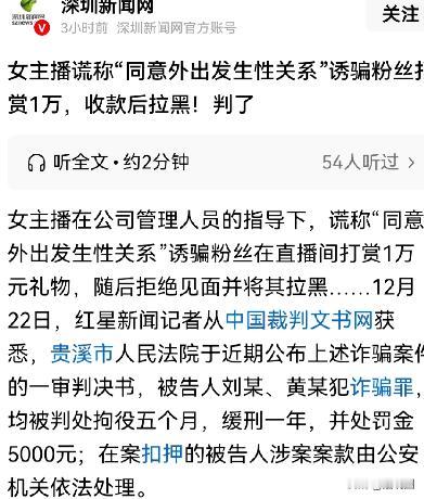 江西鹰潭,女主播同意外出发生关系,男子果断在直播间打赏1万元的礼物。不曾想,女主播竟然将男子拉黑。男子报警后,女主播及老板纷纷落网。对此,有网友好奇,男子构成嫖娼的违法行为吗? 男子刘某是一名普通上班族,平时喜欢在下班后刷刷直播解压。一次偶然的机会,他进入了一名女主播小雅(化名)的直播间。 小雅外形姣好,说话温柔,直播内容以聊天、唱歌为主,很快吸引了刘某的注意。 起初,刘某只是偶尔刷点小礼物。随着互动增多,两人逐渐在直播间外添加了联系方式。 私下聊天中,小雅对刘某表现得格外热情,言语暧昧,甚至多次暗示“如果现实中见面,关系可以更进一步”。刘某心里明白这些话的分量,但仍被对方的态度所吸引。 几次聊天后,小雅明确提出,只要刘某在直播间刷一笔“有诚意”的礼物,她就愿意线下见面,并发生关系。 为了显示自己的决心,刘某当晚直接在直播间豪刷了一万元的礼物,直播间瞬间沸腾,女主播不断道谢,老板也在后台频频示意。 让刘某没想到的是,直播结束后,他发现小雅的微信迟迟不回复。第二天再联系时,自己已经被彻底拉黑,直播间也无法再进入。刘某这才意识到,自己很可能被骗了。 一开始,刘某也犹豫过是否报警。他清楚事情本身并不光彩,甚至担心自己会因此被认定为嫖娼。 但反复思考后,他认为自己给出的1万元并非单纯“消费服务”,而是被诱导、欺骗的结果。最终,他选择走进派出所,如实说明了经过。 警方接警后高度重视。通过调查转账记录、聊天记录以及直播平台后台数据,警方发现,这并非个案。 该直播间长期存在以“线下见面”“发生关系”为诱饵,诱导观众大额打赏的行为,而所谓的“约定”,往往在打赏后便被单方面毁约。 进一步调查显示,女主播小雅并非个人行为,其背后有直播公司和老板统一策划、统一话术。 主播只负责引导、暗示,真正的收益则由公司分成。警方随即展开收网行动,将女主播及幕后老板一并控制。 案件曝光后,迅速在网络上引发热议。其中,最受关注的问题只有一个:报警的男子,算不算嫖娼? 对此,法律界人士给出了较为明确的解释。 首先,根据我国法律规定,认定嫖娼行为,必须具备两个核心要件: 一是以金钱或财物为对价; 二是实际发生或者明确达成性交易行为。 在本案中,刘某虽然主观上存在通过金钱换取性关系的想法,但关键在于,双方并未实际发生关系,也未进入实施阶段。 同时,1万元是以“直播打赏”的形式完成,并非当面或直接交付给个人作为性交易报酬。 更重要的是,从证据角度看,小雅及其公司存在明显的诈骗或组织卖淫未遂行为,其行为更符合“以非法占有为目的,虚构事实骗取财物”的特征。 因此,在警方最终处理意见中,刘某被认定为受害人,未被追究治安责任。而女主播及其老板,则因涉嫌诈骗、组织卖淫相关违法行为,被依法采取刑事强制措施。 案件尘埃落定后,网络评论区却依旧争论不断。 有人认为:“男子动机不纯,就算没发生,也不该轻易免责。” 也有人表示:“法律讲证据,不是道德审判,不能因为想法就定罪。” 对此,办案民警也给出了提醒: 直播打赏本身是自愿行为,但一旦与违法内容挂钩,无论是主播还是观众,都可能触碰法律红线。尤其是那些打着“私下见面”“特殊服务”旗号的暗示,背后往往隐藏着诈骗或更严重的违法犯罪。 这起案件,也给不少沉迷直播的观众敲响了警钟。屏幕另一端的“暧昧承诺”,未必是真心,更多时候只是精心设计的套路。 而一旦陷入其中,不仅可能损失金钱,甚至还会面临法律风险。 正如网友所说:“这不是一场简单的打赏纠纷,而是一堂代价不小的现实法治课。”