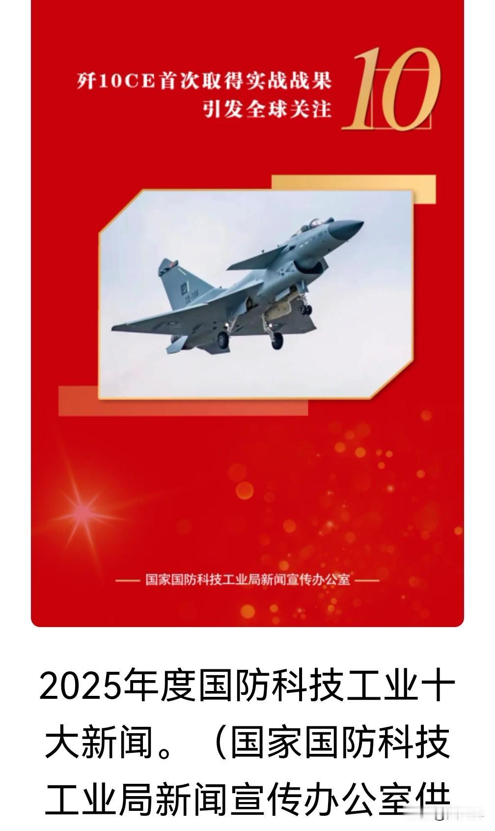 歼10CE首次取得实战战果成为中国军工十大新闻引发乌媒关注 1月15日,乌克兰媒体“防务快讯”“RBC-乌克兰”注意到中国国防科工局发布的“2025年年度国防科技工业十大新闻”的第十大新闻:歼10CE首次取得实战战果引发全球关注。乌媒由此认为,中国官方证实,国产歼-10战机在空战中击败阵风战机,这也是中国首次官宣国产战机取得击落他国战机的战果。 报道称,这一消息几乎可以证实,列装了约20架歼-10CE的巴基斯坦空军,在空战中击落了印度空军的阵风战机。2025年5月,巴基斯坦空军的歼-10CE战机使用霹雳-15远程空空导弹,在约200公里的距离上击落了印度的达索阵风战机。 巴基斯坦此前也曾通报击落五架印度战机,且被击落的机型不仅可能包含达索阵风,还可能有苏-30MKI战机。而歼-10CE在此次作战行动期间未出现任何战损。 2025年5月,巴印两国战机发生相互空袭,双方共有125架战机参与此次空战,且均未侵入对方领空。印度空军在此次冲突中至少损失了一架2016年引进的阵风战机。
