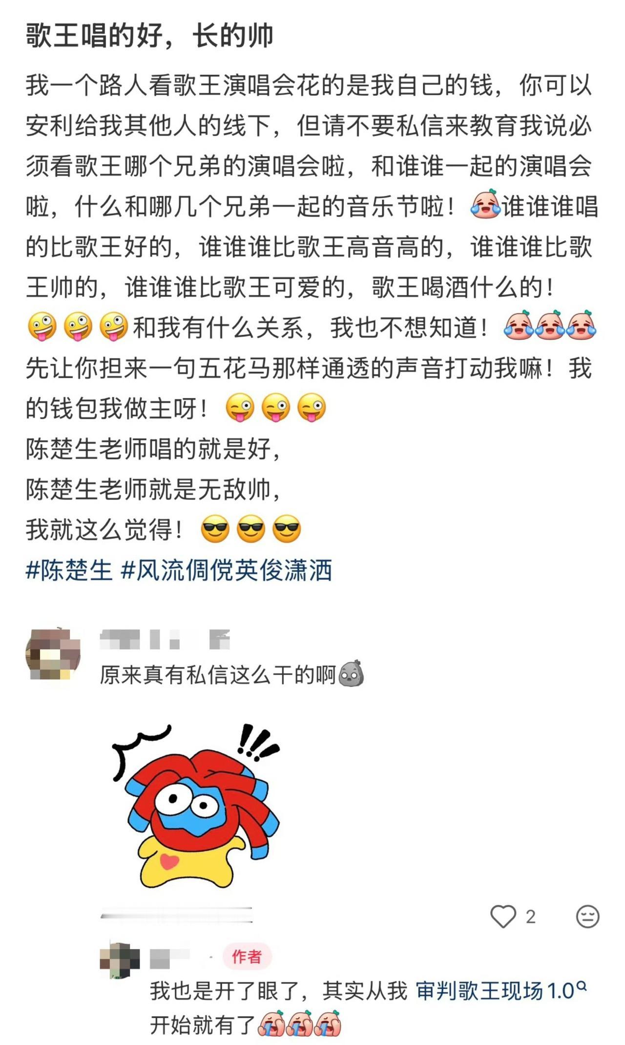 陈楚生一路人粉声称有人私下发信安利再就业其他兄弟。 原来真的有人会如此操作。 这