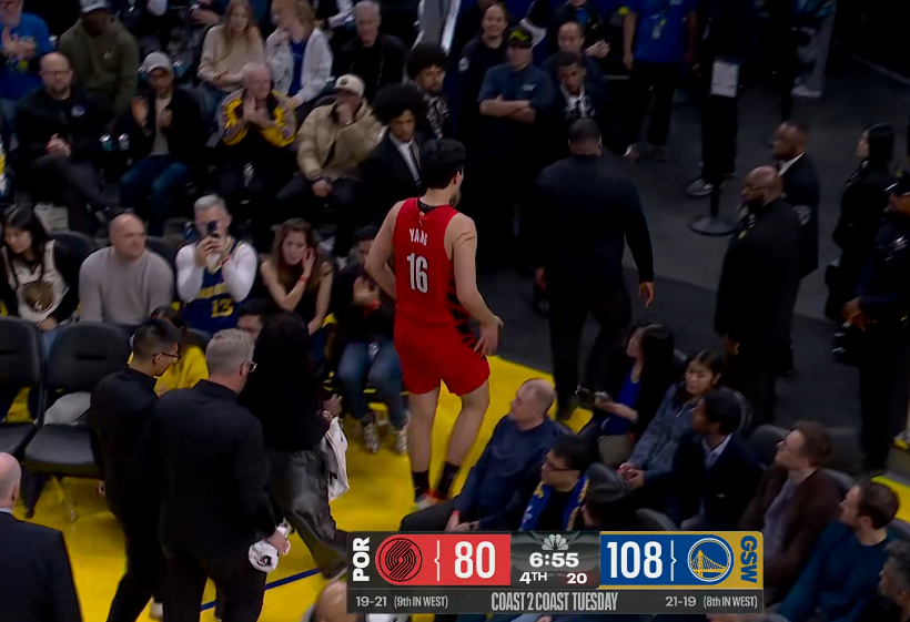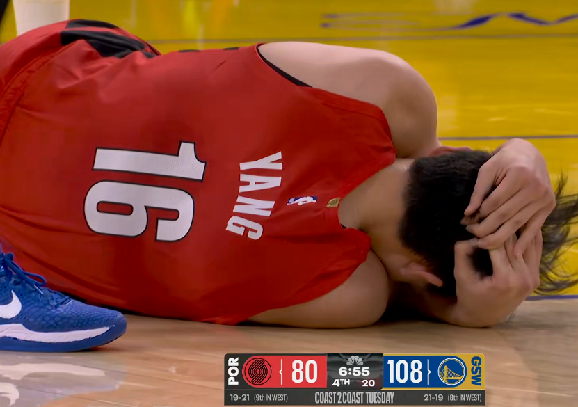 杨瀚森真的运气有点糟糕,完全没有准备的情况下被膝盖顶到后脑勺。队医简单检查之后,杨瀚森回更衣室了,好不容易有比较长的时间。