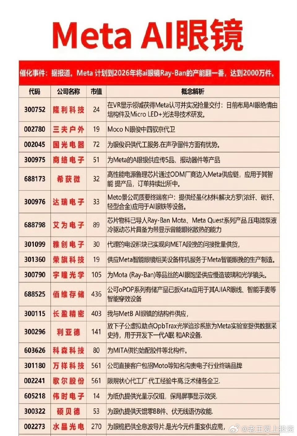 Meta AI眼镜产能翻倍,A股供应链迎发展新机遇Meta计划2026年将Ray-Ban AI眼镜产能翻倍至2000万件,这一动作直接点燃A股相关供应链板块的投资热情。从硬件配套来看,长盈精密、隆利科技为眼镜提供结构件核心支撑,宇瞳光学则包揽玻璃与光学镜头制造,水晶光电的全息波导片更是光学元件的关键;电子元器件领域,商络电子的传感器、艾为电子的散热芯片,以及德赛电池的供电模块,共同构筑起产品的技术底座。此外,三夫户外拿下代工订单,国光电器在声学部件上形成优势,佰维存储的存储产品也成功嵌入Meta智能设备体系。Meta的产能扩张,不仅为A股相关企业带来订单增量,更推动Micro LED、光导技术等赛道的技术落地,科技成长板块的细分机遇正加速显现。