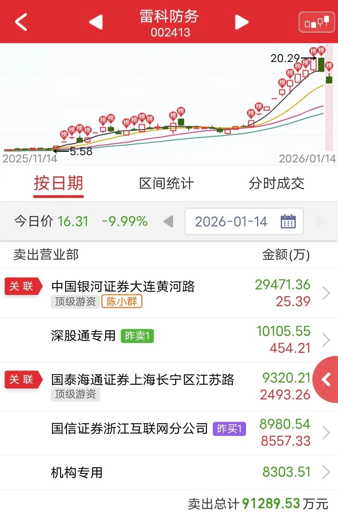 陈小群爆卖2.9个亿!今天商业航天板块继续调整,航天发展盘中2连跌停,雷科防务也2连跌停。盘后龙虎榜显示,陈小群卖出2.9个亿的雷科防务!不出所料群总又被喊“见顶哥”了。游资陈小群