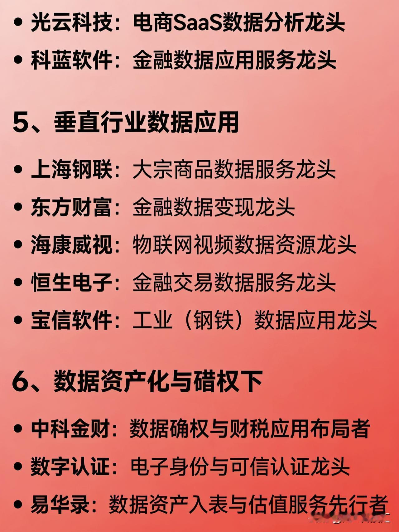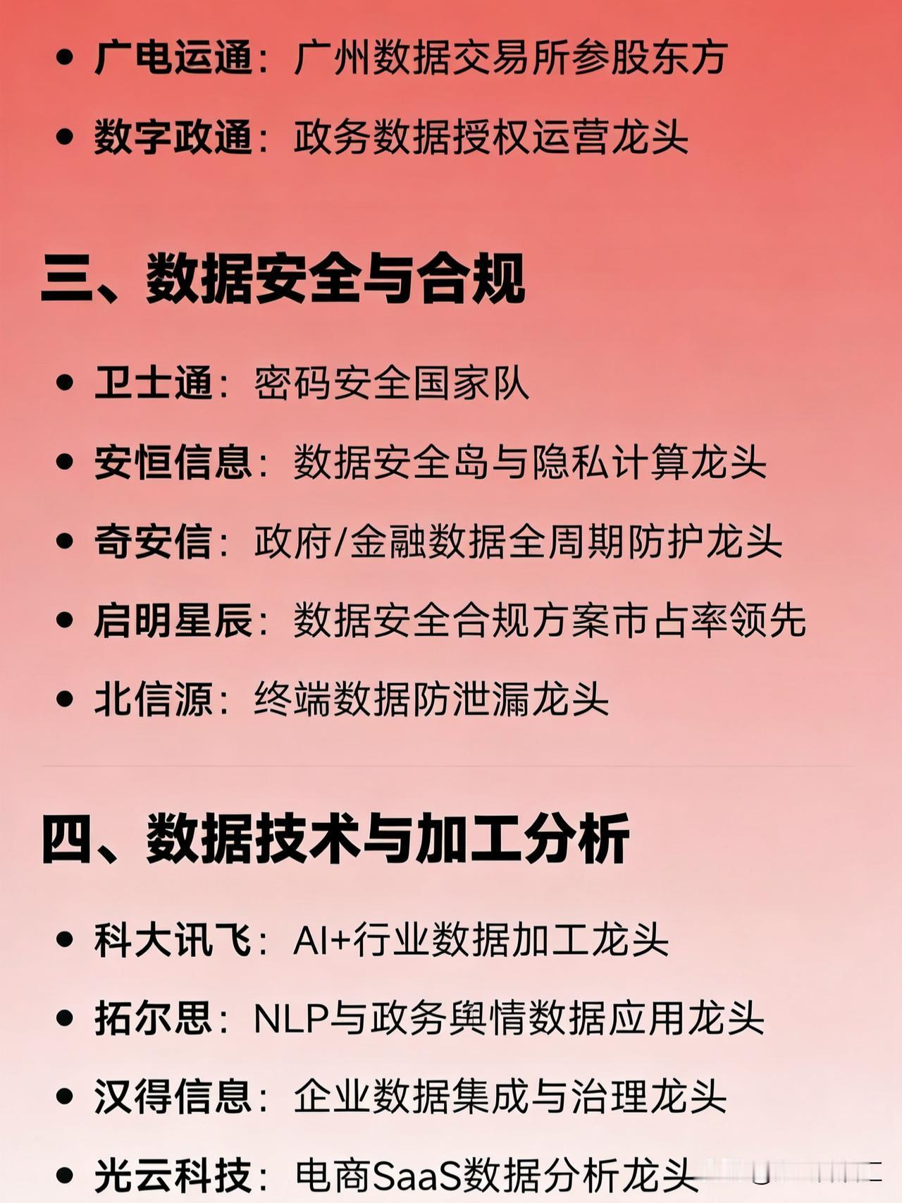 数据要素概念细分方向的龙头企业一、数据基础设施/算力底座数据港:绿色数据中心龙头中科曙光:液冷智算中心龙头浪潮信息:AI服务器全球龙头易华录:政务“数据湖”基础设施龙头深桑达A:“东数西算”算力调度龙头二、数据资源与交易平台云赛智联:地方数据交易所(上海)运营龙头人民网:国家级数据平台参与者浙数文化:浙江大数据交易中心控股方广电运通:广州数据交易所参股东方数字政通:政务数据授权运营龙头三、数据安全与合规卫士通:密码安全国家队安恒信息:数据安全岛与隐私计算龙头奇安信:政府/金融数据全周期防护龙头启明星辰:数据安全合规方案市占率领先北信源:终端数据防泄漏龙头四、数据技术与加工分析科大讯飞:AI+行业数据加工龙头拓尔思:NLP与政务舆情数据应用龙头汉得信息:企业数据集成与治理龙头光云科技:电商SaaS数据分析龙头科蓝软件:金融数据应用服务龙头五、垂直行业数据应用上海钢联:大宗商品数据服务龙头东方财富:金融数据变现龙头海康威视:物联网视频数据资源龙头恒生电子:金融交易数据服务龙头宝信软件:工业(钢铁)数据应用龙头六、数据资产化与确权中科金财:数据确权与财税应用布局者数字认证:电子身份与可信认证龙头易华录:数据资产入表与估值服务先行者