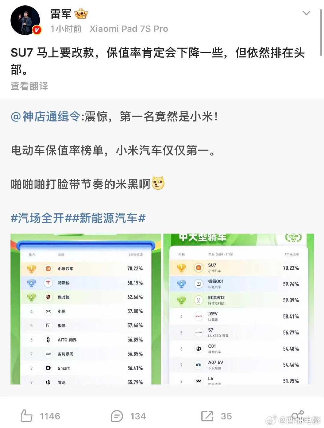 小米SU7要改款雷军回应SU7保值率 1月15日,发文称小米SU7要改款,并回应小米SU7保值率一事:“SU7 马上要改款,保值率肯定会下降一些,但依然排在头部。”雷军悼念聂卫平
