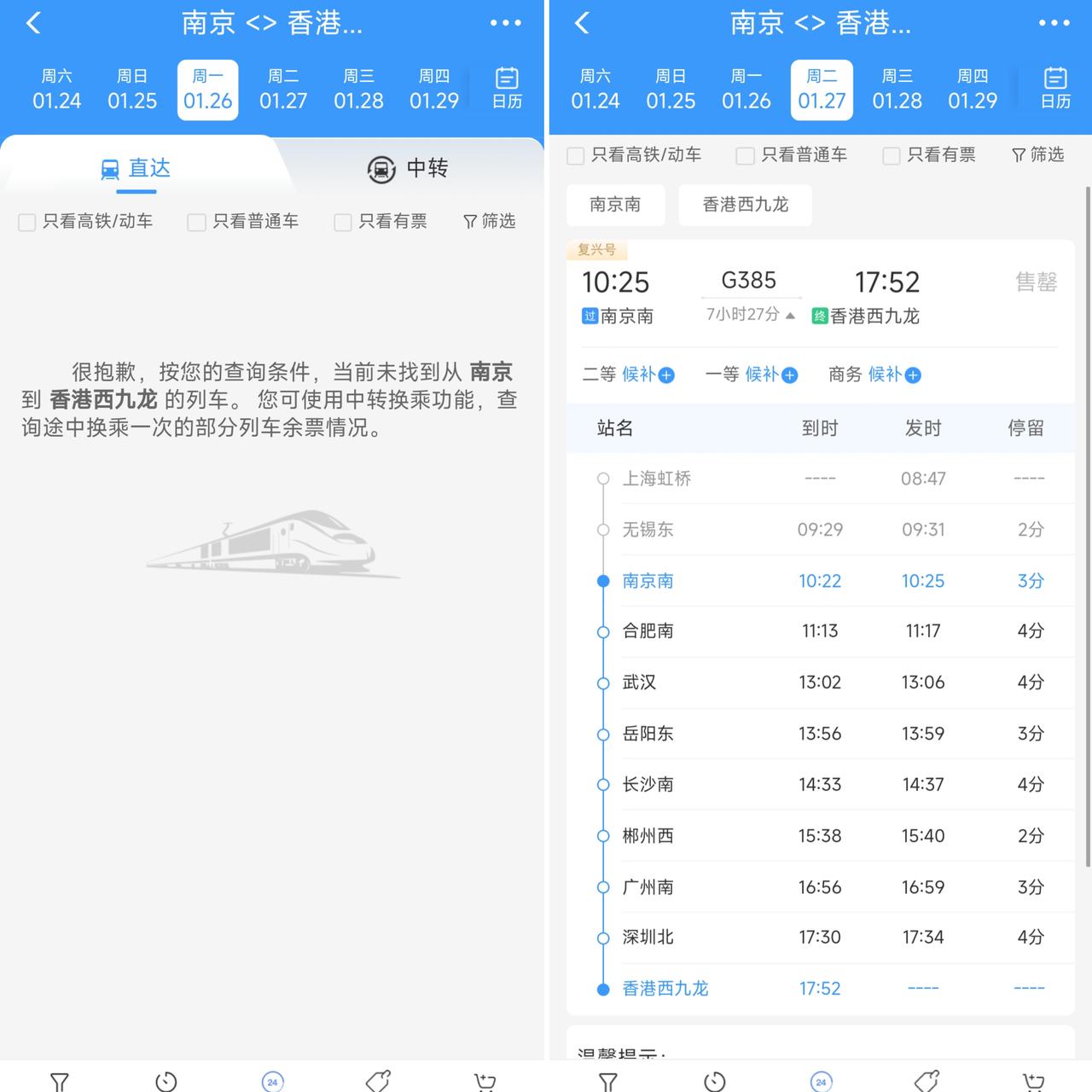 南京还是很有实力的,经过不懈的努力在1月27日首次迎来直达香港的高铁车次,顺便还能让无锡、合肥跟着借光。 仔细观察G385次列车的开通,上海可谓是彰显了格局,特意往北部兜了一圈只为让更多的城市可以坐高铁直达香港。因此对于上海人来说乘坐这趟列车去香港的车票价格比其它车次能贵上好几百元钱,看到这里不禁感慨上海对周边的小兄弟真的很照顾。