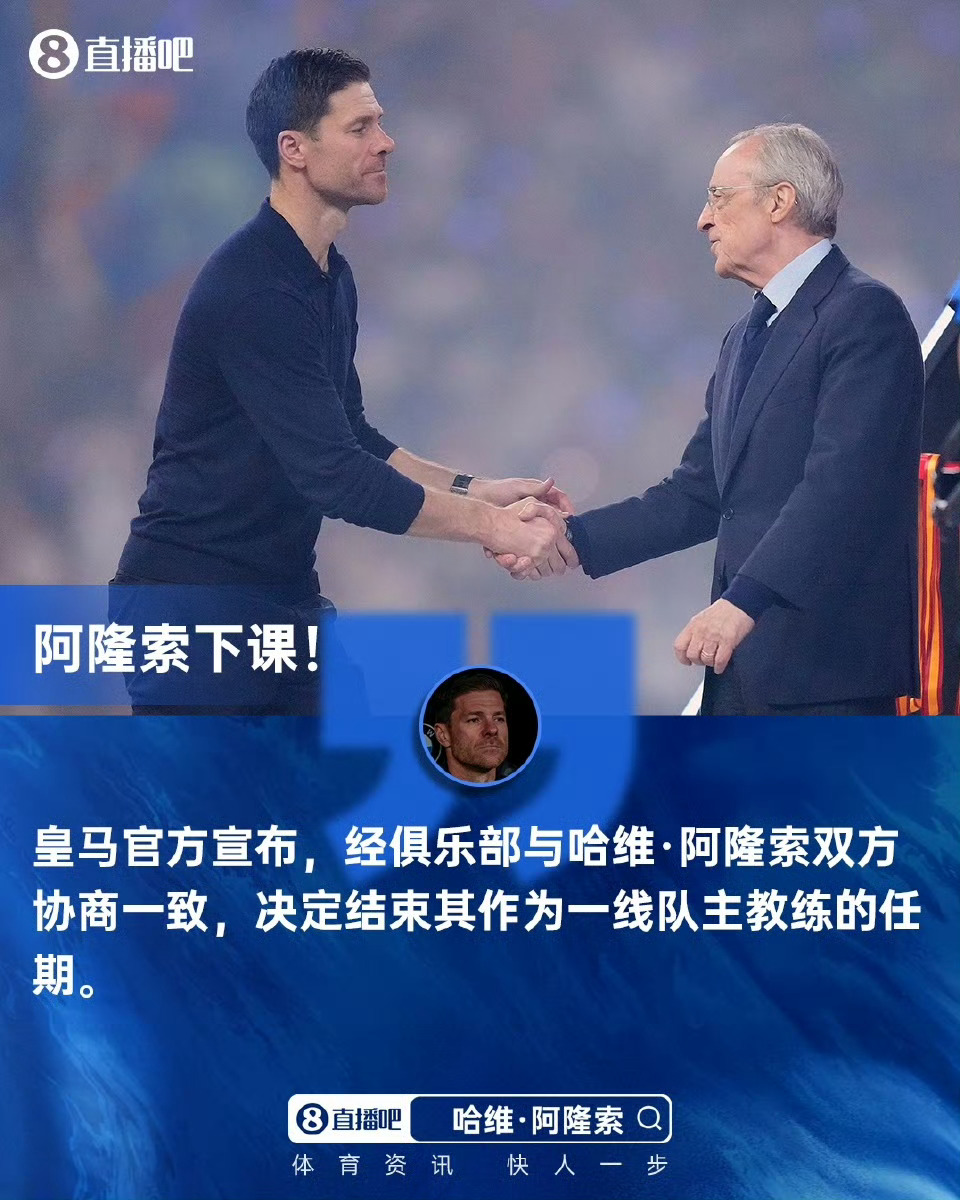 国际足坛重磅突发新闻!北京时间今天凌晨,皇家马德里俱乐部正式公布,经与一线队主教练哈维-阿隆索共同商议,决定结束他在皇马的执教。在官方声明中,皇马向哈维-阿隆索及他的团队表达了诚挚感谢,并强调他作为俱乐部传奇人物,始终秉持皇马价值观,赢得了所有球迷的尊重与爱戴,这里永远是他的家。一夜之间,干脆利落!皇马进入新阶段。