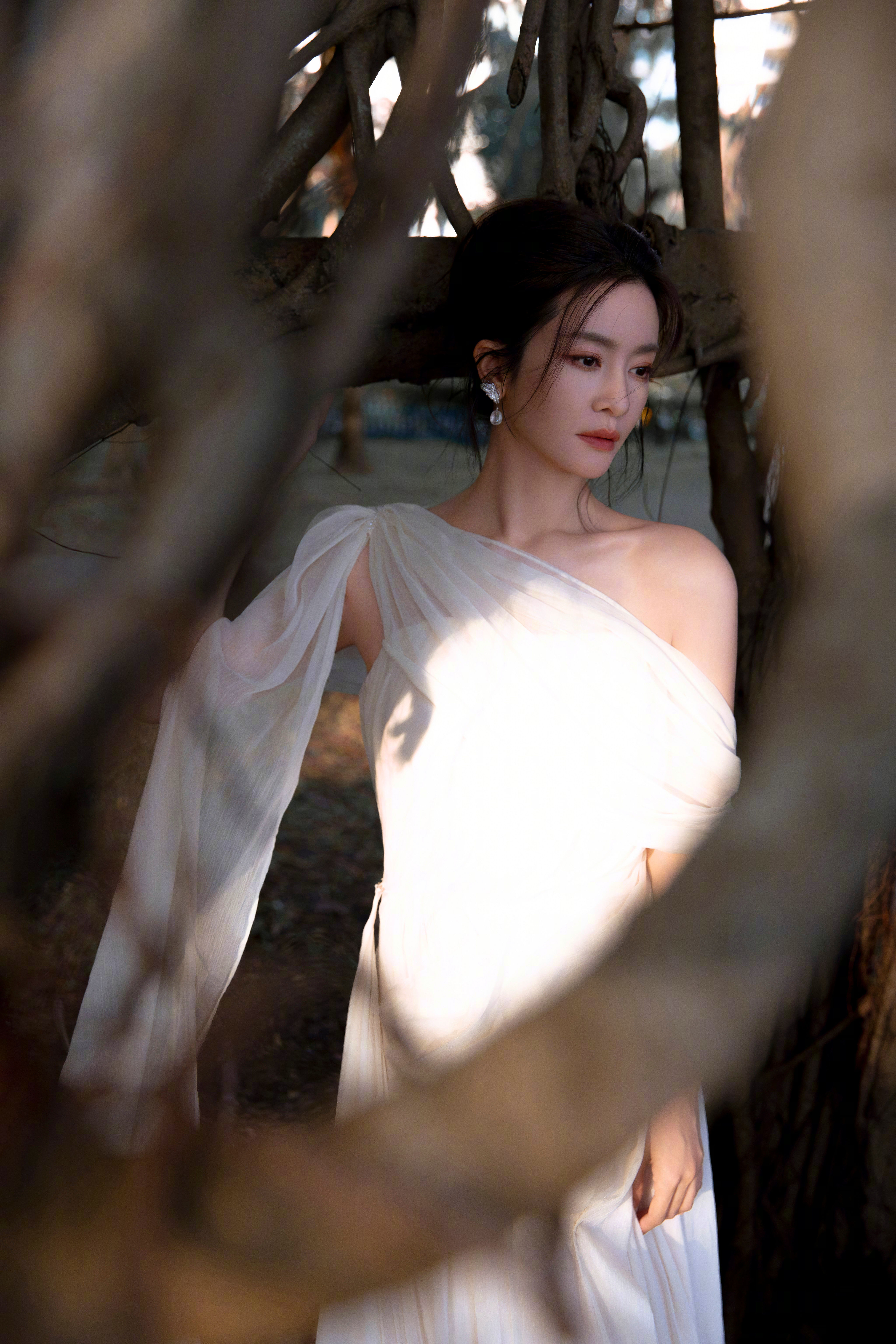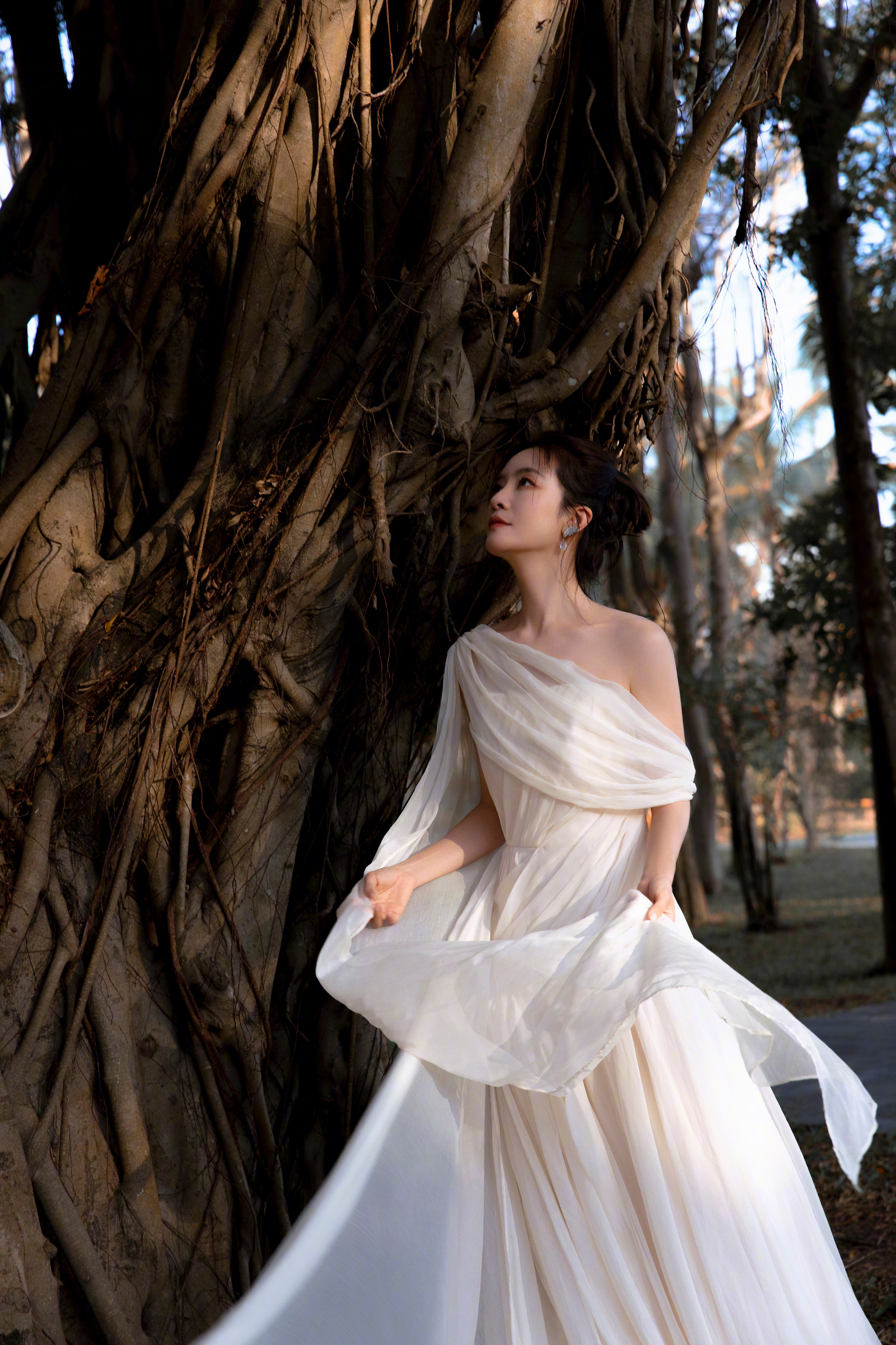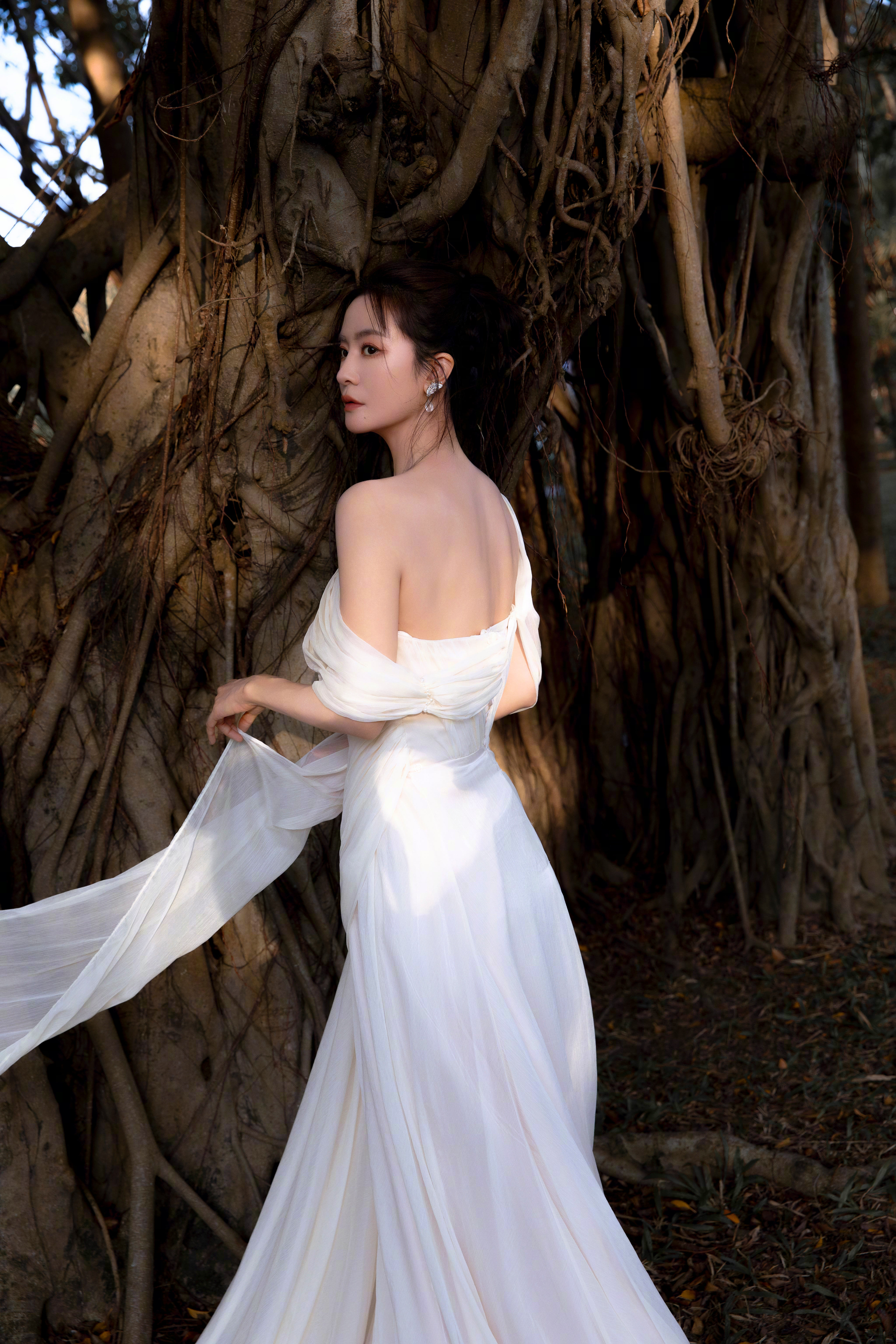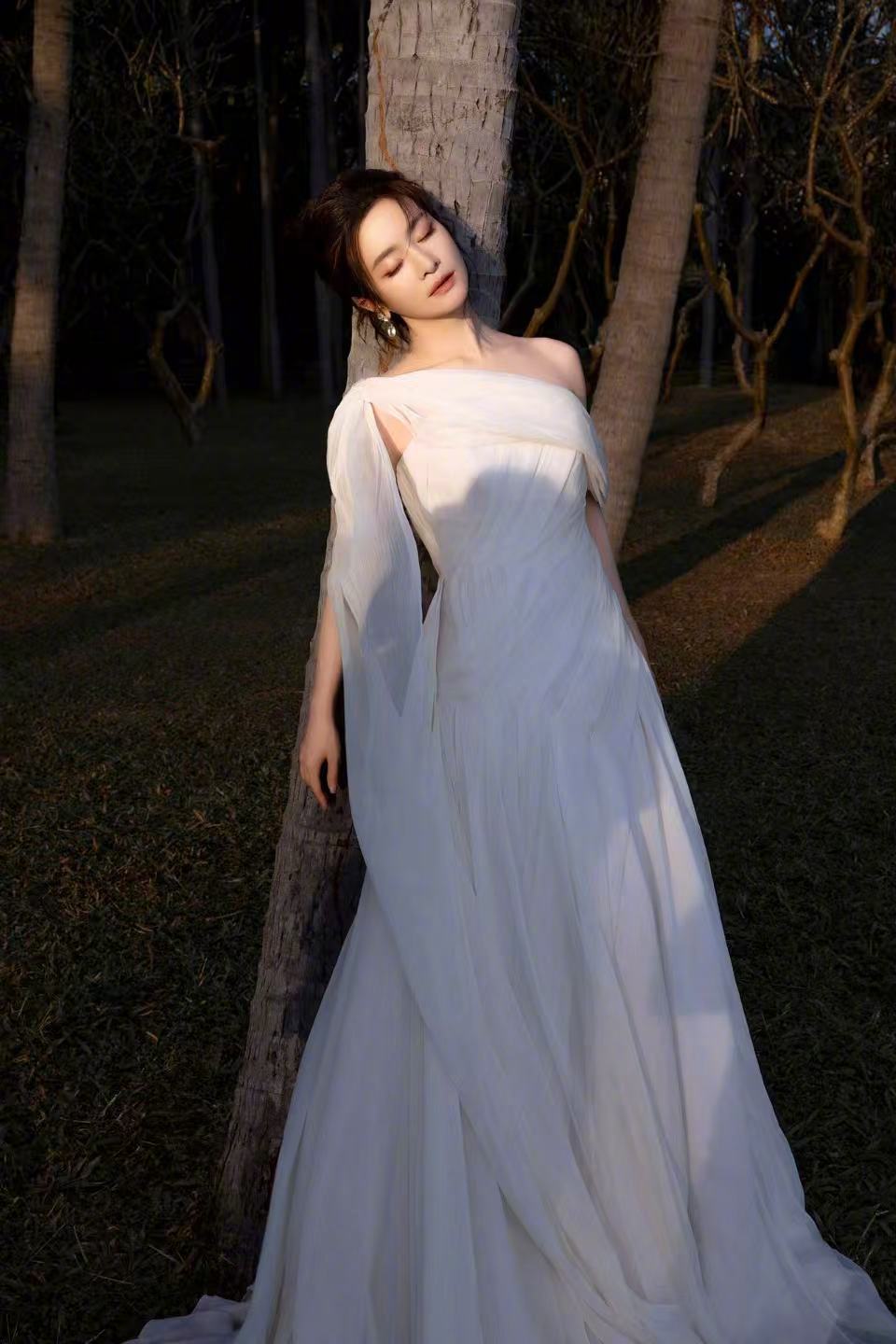 李晟 浅纱斜肩长裙勾勒出绝美的身形线条,斜肩设计露出来的肩颈弧度清艳又勾人。