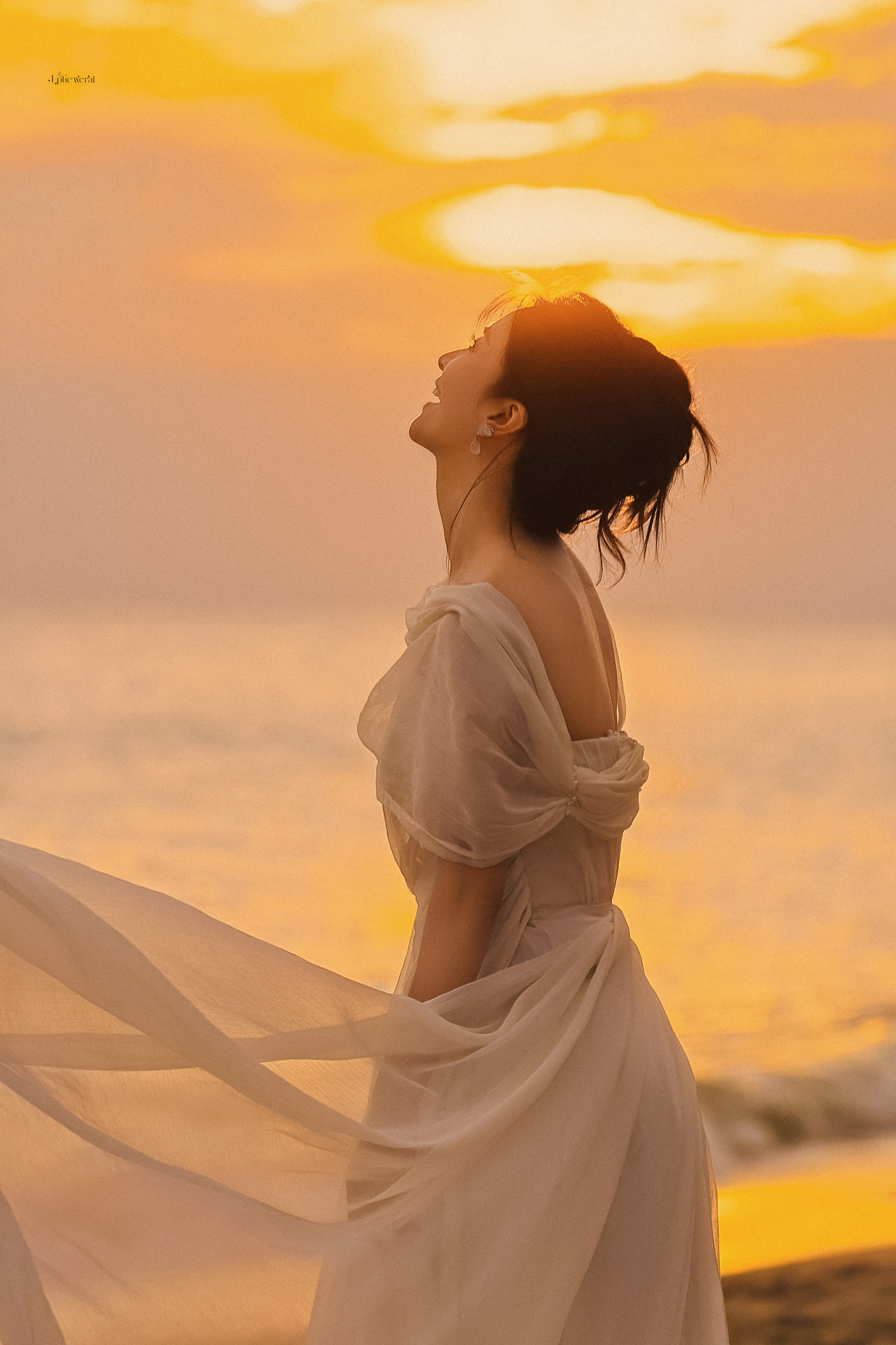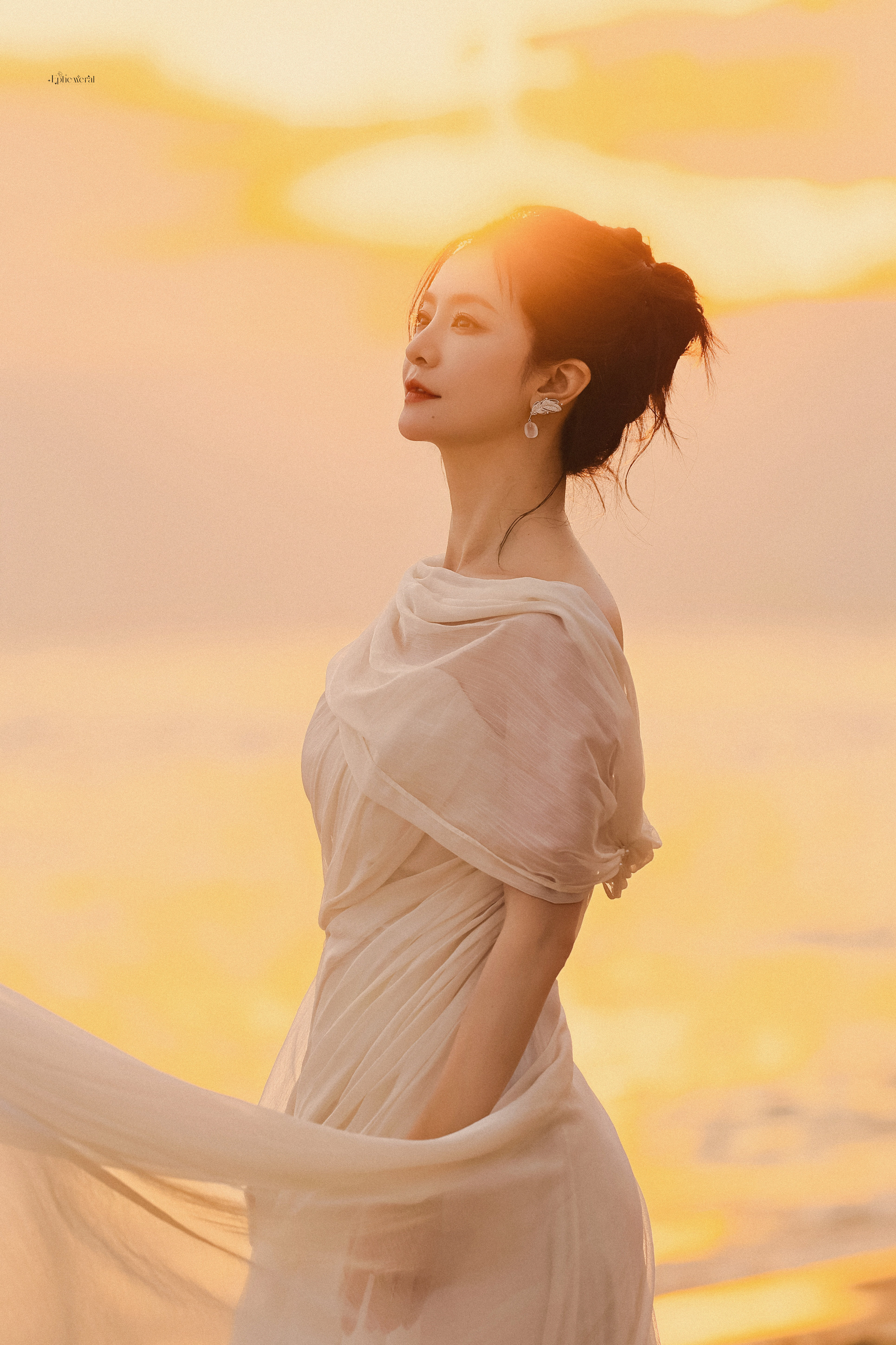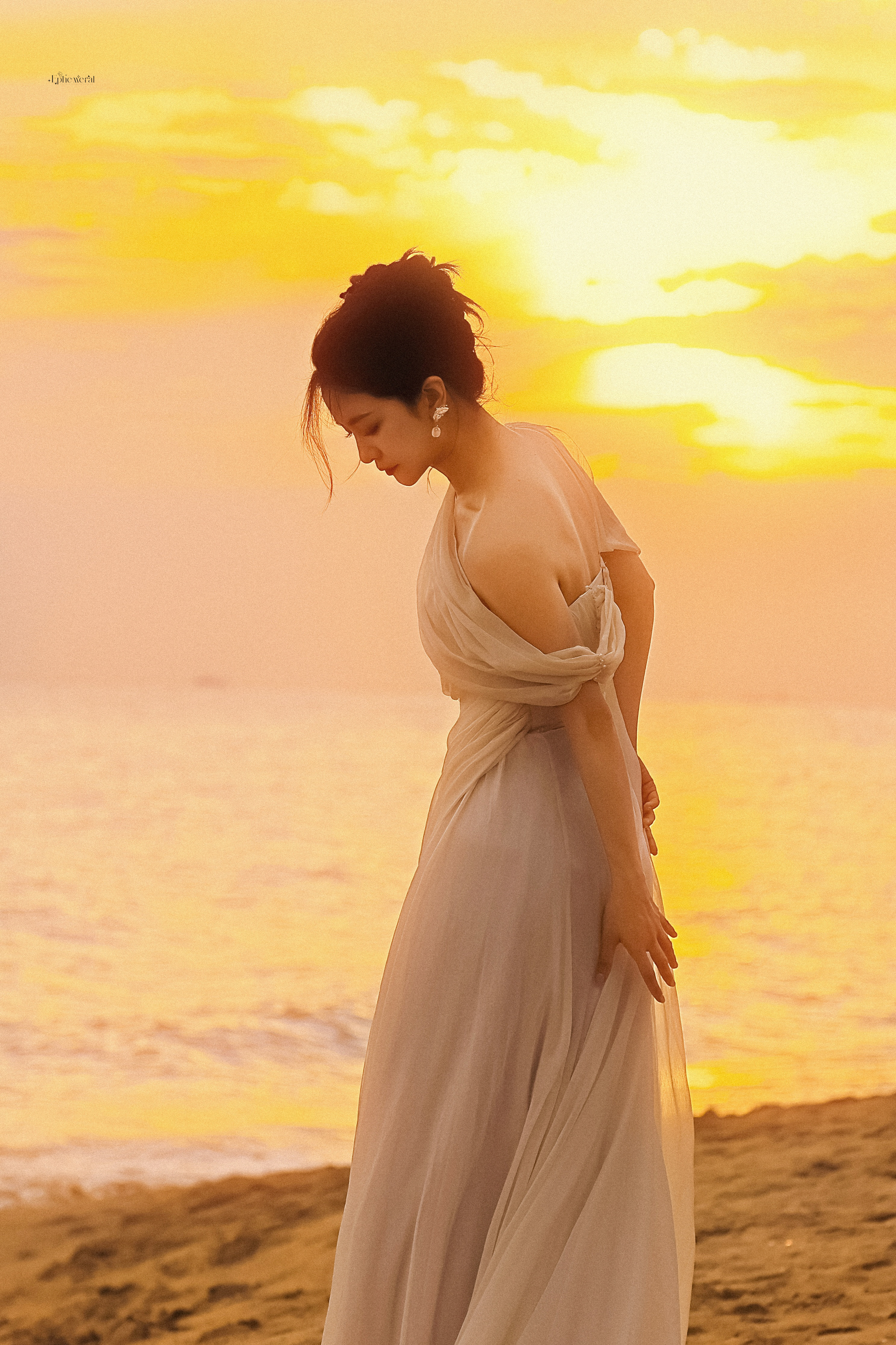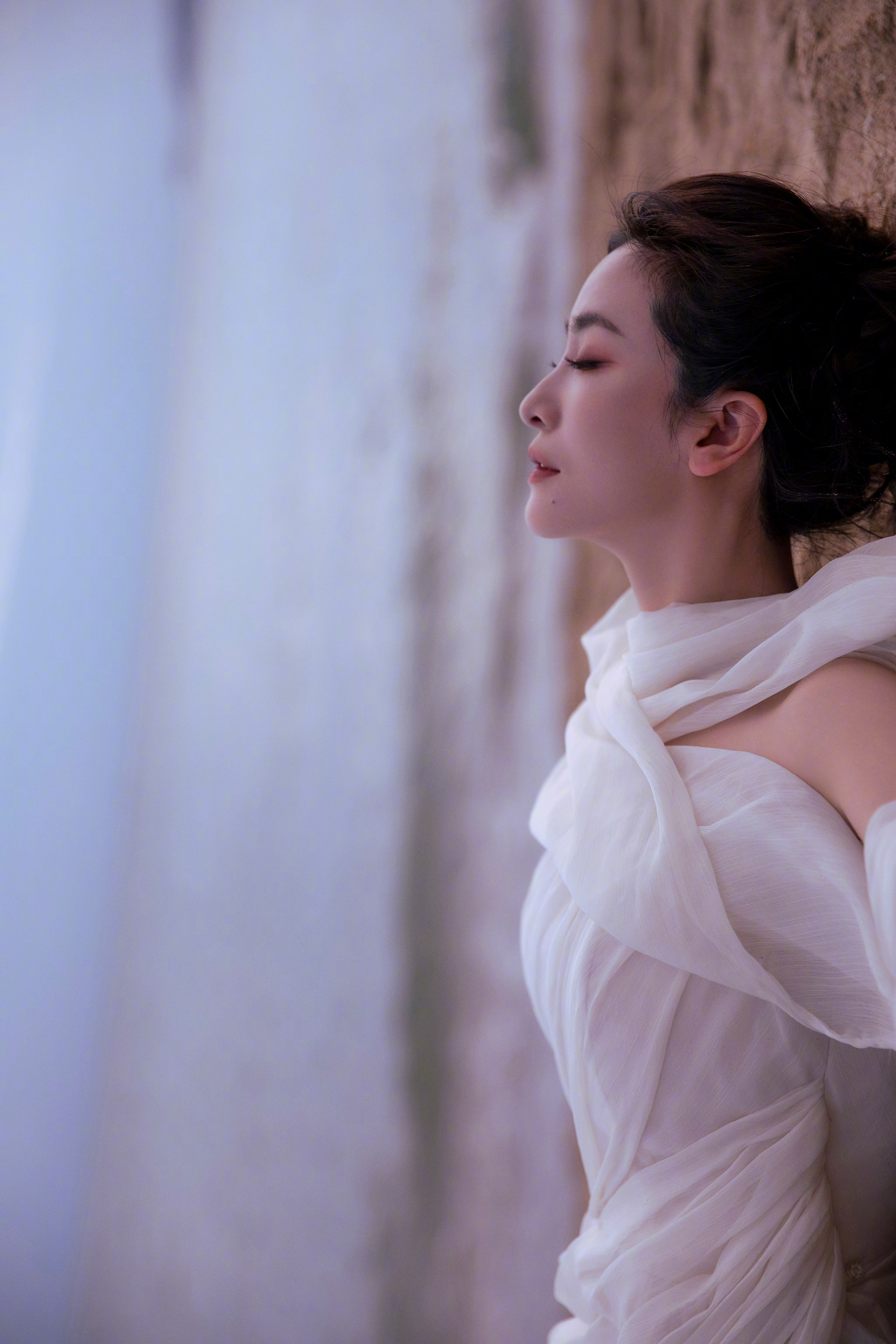 李晟 浅纱斜肩长裙勾勒出绝美的身形线条,斜肩设计露出来的肩颈弧度清艳又勾人。