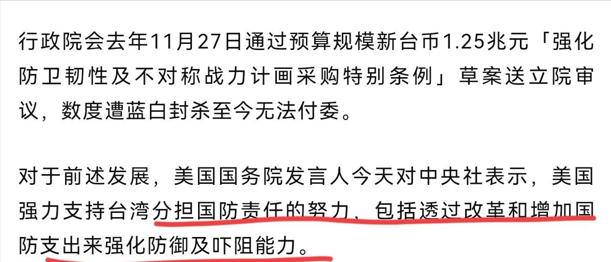 美国又改口了! 1月15日,根据岛内媒体报道,美国国务院发言人表示,美国强力支持台湾分担“国防”责任的努力,包括通过改革和增加“国防”支出来强化防御及威慑能力。我们欢迎赖清德宣布台湾计划在今年将国防支出占GDP比重提高至3%以上,并在2030年提高到GDP的5%。 美国这翻脸速度比翻书还快,简直把双标玩到了极致! 1月7日特朗普的表态“中方认为台湾是中国一部分,怎么处理是中方自己的事”当时可是让岛内炸了锅,“台独”分子吓得魂不守舍,赖清德办公室紧急发声明想圆场,结果还没等他们缓过劲来,美国国务院就来了个180度大转弯。 这前后才8天时间,美国就从“不干涉内政”的伪装,变成了“怂恿台湾扩军”的黑手,这种自相矛盾的操作,也就美国能干得出来! 其实特朗普的话本来就是虚情假意的套路。根据五角大楼2025年12月的报告,美国自己都算得明明白白,介入台海冲突的成本远大于收益,真打起来得不偿失。所以特朗普才故意说“台湾问题是中方自己的事”,本质是想甩锅,让台湾自己多扛责任,而美国只需要躲在后面卖军火、赚差价。 果不其然,他嘴上说着“不干涉”,行动上却一点没闲着,上个月刚批了111亿美元的对台军售,现在又逼着台湾提高国防支出,说白了就是想让台湾把更多的钱拿来买美国的淘汰武器,把“台独”分子武装成炮灰,自己坐收渔利。 而赖清德更是上赶着当冤大头。他之前就喊着要编列1.25万亿新台币的特别军事预算,结果被在野党团联手否决了好几次,现在有了美国的“背书”,立马又跳出来宣布要把国防支出提到GDP的3%,2030年还要涨到5%。 这意味着什么?按台湾2025年的GDP总量大概22.7万亿新台币算,今年国防支出就要超过6800亿新台币,到2030年更是要突破1万亿新台币,相当于把台湾财政收入的近一半都砸在武器上。 可台湾现在是什么情况?民生问题一大堆,缺水缺电缺工,年轻人失业率居高不下,中小企业因为美国的对等关税苦不堪言,赖清德不把钱花在改善民生上,反而要拿来买一堆废铜烂铁,这不是把台湾民众当冤大头宰吗? 更讽刺的是,美国一边逼着台湾加国防预算,一边还在对台湾经济下黑手。2025年4月美国宣布全球对等关税,台湾对美关税高达64%,而美国对台只有32%;8月又对台湾进口加征20%关税,虽然比32%低,但比日韩谈成的15%高了不少,直接让台湾中小企业的产品失去竞争力。 更狠的是,美国还逼着台湾的半导体企业迁到美国,动不动就指责台湾“偷芯片”,用各种手段压榨台湾的经济利益。 现在倒好,榨完经济又要榨国防,美国这是把台湾当成了“予取予求”的提款机,而赖清德却还乐呵呵地配合,真是让人笑掉大牙。 美国之所以这么急着让台湾提高国防支出,核心就是想“以台制华”,把台湾打造成“刺猬岛”,延缓中国统一的进程。 五角大楼的报告里早就写了,随着中国军力的不断增强,美国在台海的优势越来越小,所以他们才想让台湾自己扛大旗,用台湾的人力物力消耗大陆。 可他们忘了,台湾是中国不可分割的一部分,两岸统一是历史大势,不是靠几架飞机、几门大炮就能阻挡的。 军事专家早就戳破了:“就算台湾把国防支出提到GDP的5%,买再多美国的过时武器,也改变不了两岸军力的绝对差距,顶多是让台湾多流点血,让美国多赚点钱。” 而赖清德心甘情愿当美国的棋子,说到底就是为了自己的“台独”野心。他心里很清楚,没有美国的支持,他的“台独”行径根本站不住脚,所以才不惜牺牲台湾民众的利益,疯狂讨好美国。 可他忘了,美国从来不会真心“保台”,只会把台湾当成棋子,一旦失去利用价值,就会毫不犹豫地抛弃。 就像特朗普说的,“任内不会发生台海冲突,下台后难说”,这句话已经把美国的真实想法暴露得明明白白:他们只关心自己的利益,根本不管台湾的死活。 岛内民众早就看穿了美国和赖清德的把戏,纷纷吐槽:“美国就是把我们当炮灰,赖清德就是卖国贼!”“把民生的钱拿来买武器,我们以后喝西北风吗?”“5%的国防支出,是要把台湾拖进战争吗?” 就连民进党内部也有不同声音,有前民代私下表示:“这么高的国防支出根本不现实,台湾财政撑不住,最后只会拖垮整个经济。” 可赖清德根本不管这些,为了自己的政治私利,硬是要把台湾往绝路上逼。 其实大家心里都清楚,美国的这种操作,不仅改变不了两岸统一的大势,反而会加速统一的进程。 解放军现在的常态化巡航已经说明了一切,舰艇穿越海峡、空军绕岛飞行、火箭军展开演练,我们有足够的能力和决心捍卫国家主权和领土完整。 美国现在的所作所为,不过是困兽犹斗。他们一边想让台湾当炮灰,一边又不敢亲自下场,只能靠嘴炮和军售续命。 而赖清德的“台独”行径,更是螳臂当车,最终只会落得身败名裂的下场。