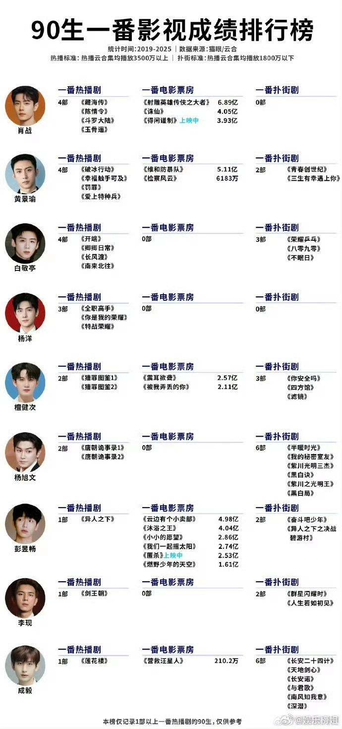 90生一番成绩云合统计的肖战 黄景瑜 白敬亭 杨洋 檀健次 杨旭文 彭昱畅 李现 成毅的影视剧实力