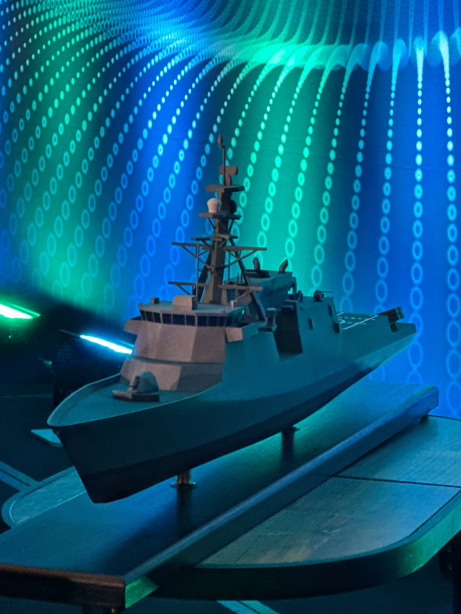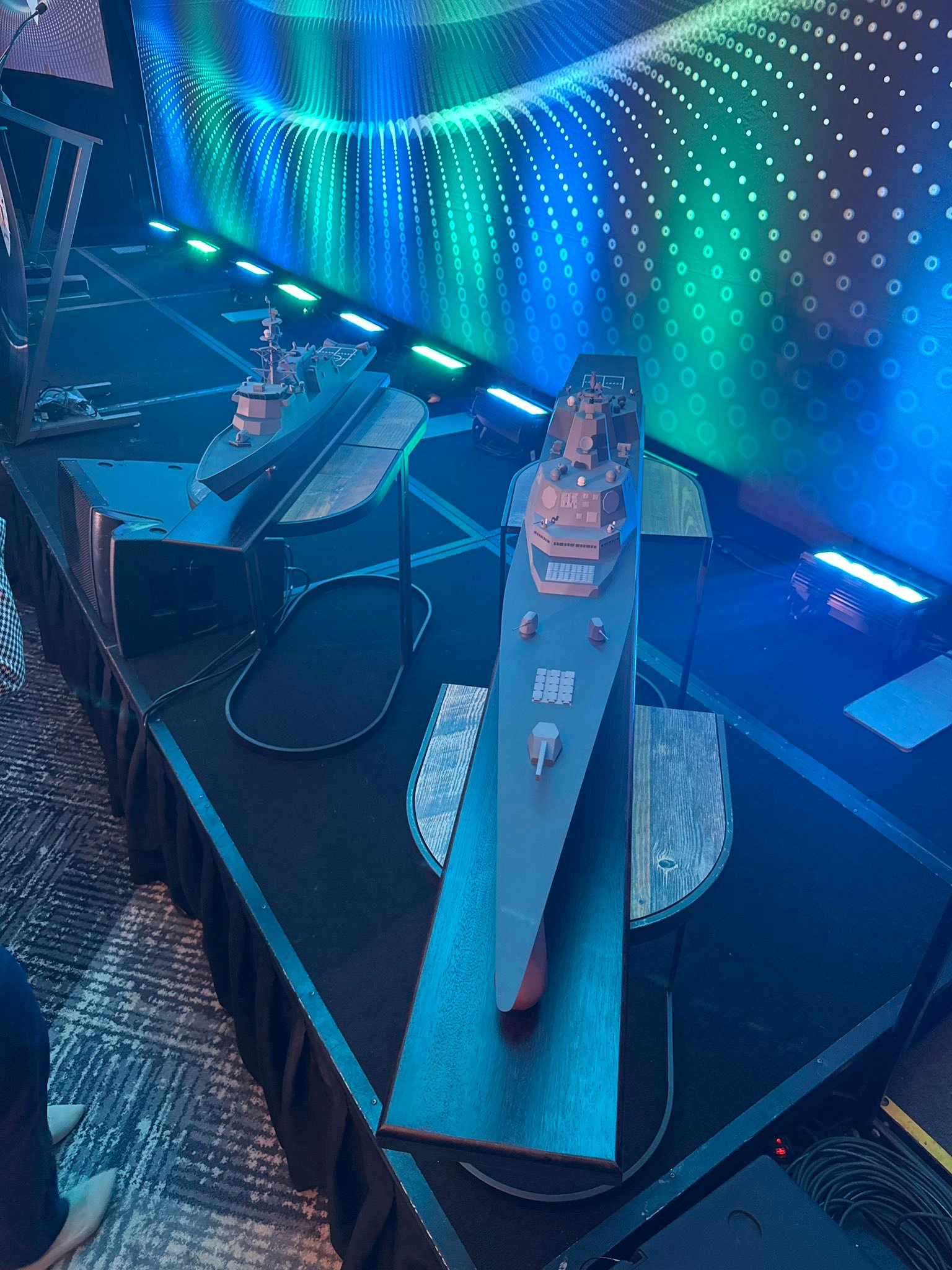 中外舰闻 烽火问鼎计划 SNA2026上在海军秘书长SECNAV演讲时展出的BBG(X)和FF(X)缩小比例模型。和概念图对比,看起来BBG(X)取消了机库中间的VLS,而CPS也采用了新款专用垂发,(而非“弗吉尼亚”BlkV上的APM)一共12坑;而FF(X)后甲板上未搭载Mk70。