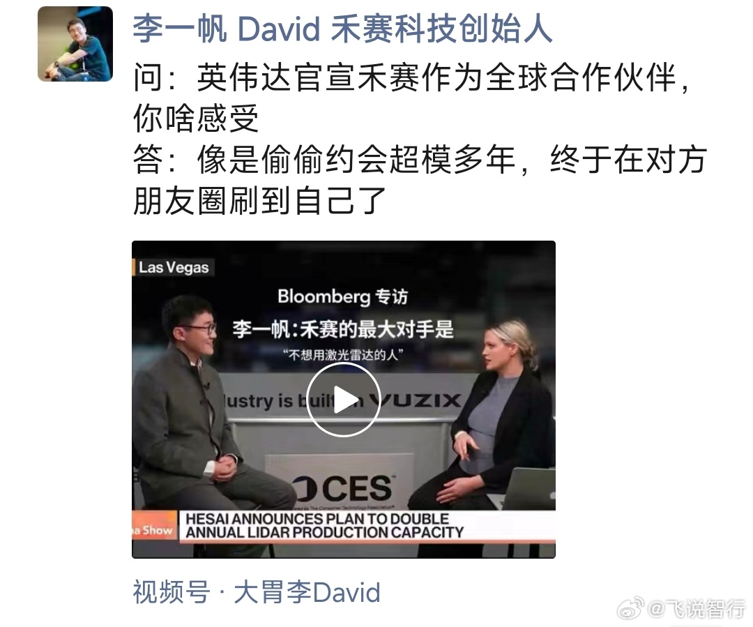 给大家分享一个CES上的趣闻。今天,禾赛联合创始人及CEO李一帆在2026 CES 接受了彭博社的采访。在采访中,面对竞争和挑战方面的问题时,他表示,全球市场更大、英伟达让L4变得更简单更低风险、禾赛的竞争对手是不想用激光雷达的人、未来机器人市场交易量和利润率会比汽车市场更大。这个回答的背景得给大家科普下,就是英伟达的老黄在此次CES上宣布禾赛成为他们的全球合作伙伴。再回到一帆总的回答上看,回答的很接地气,他们的对手当然就是不用激光雷达的人了,但随着L4自动驾驶和Robotaxi的加速普及,以及机器人市场的增长,激光雷达的量产量自然也会增长,毕竟这些领域不使用激光雷达,首要的安全就无法保证。一帆总还在他的朋友圈里还分享了一个小片段,当彭博社记者问他英伟达官宣禾赛成为全球伙伴时,他是啥感受?他回答道,就像偷偷约会超模多年,终于在对方朋友圈刷到自己了。哈哈哈,这个比喻好笑且贴切,很符合一帆总的性格。禾赛成为英伟达激光雷达合作伙伴飞说智行大v聊车