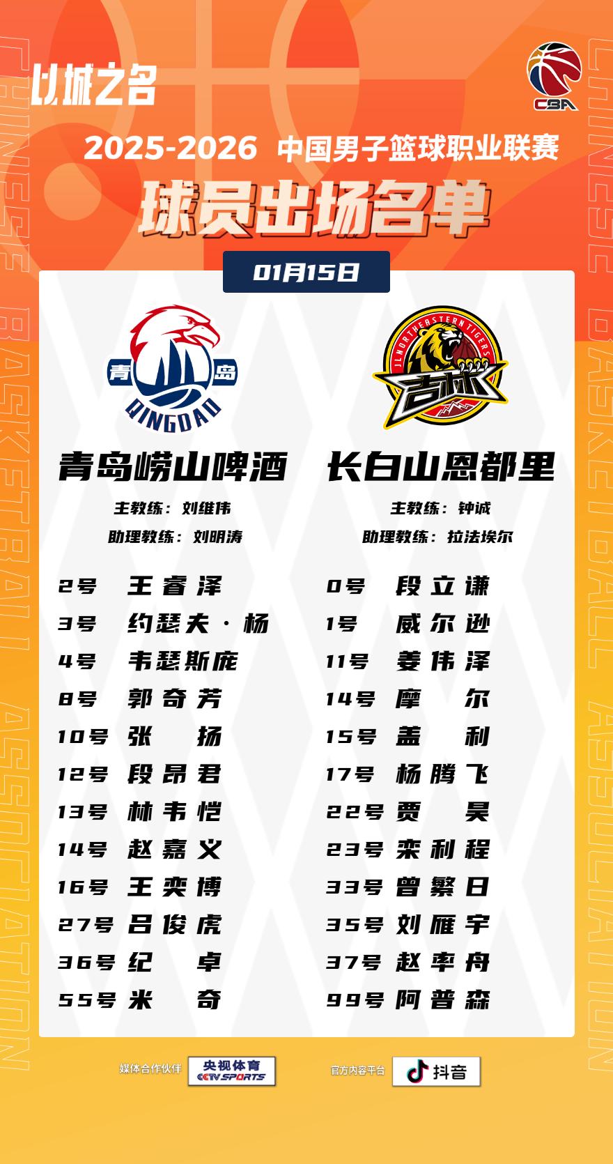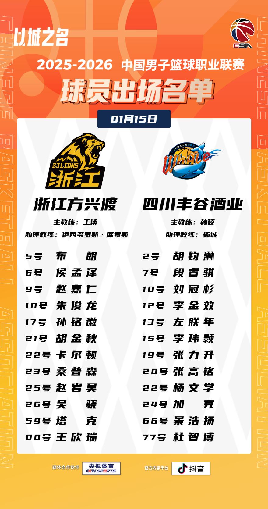 【大名单出炉】2025-2026赛季CBA联赛常规赛第十五轮今晚继续进行,5场比赛将在19:35同时跳球,敬请期待!CBA联赛 以城之名