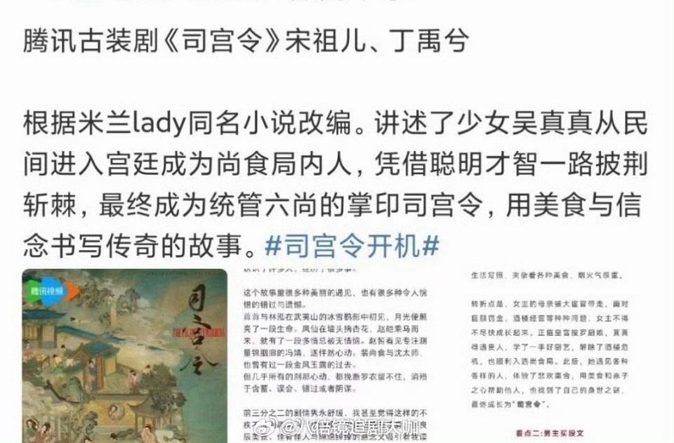 宋祖儿司宫令故事梗概看到宋祖儿《司宫令》的故事梗概,已经等不及要追剧了!就是说宋祖儿选剧本的眼光绝了吧,从剧情到人设,这样的本子,在内娱也是香饽饽了啊!咱们的祖鹅古装剧造型,谁看了不心动啊,侯燥开机!司宫令男女主人设