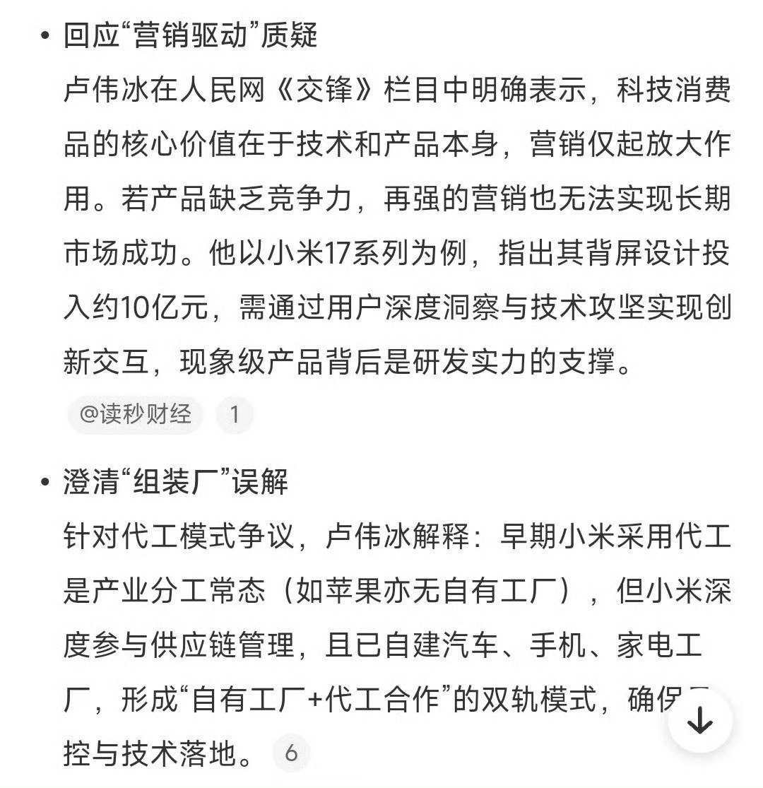 卢伟冰称价值创造是小米的责任卢伟冰说“价值创造是小米的责任”,其实戳中了当下行业的核心矛盾。现在市场不缺内卷式价格战,缺的是实打实的创新突破——小米这两年的动作很能说明问题:3纳米玄戒O1芯片、SU7 Ultra纽北登顶、17系列连续光变技术,都是从底层硬科技入手做突破。说到底,企业的责任不该是低价抢市场,而是用技术把行业天花板拉高,让用户和产业都能受益。卢伟冰谈价值创造科技企业的破内卷思路小米科技