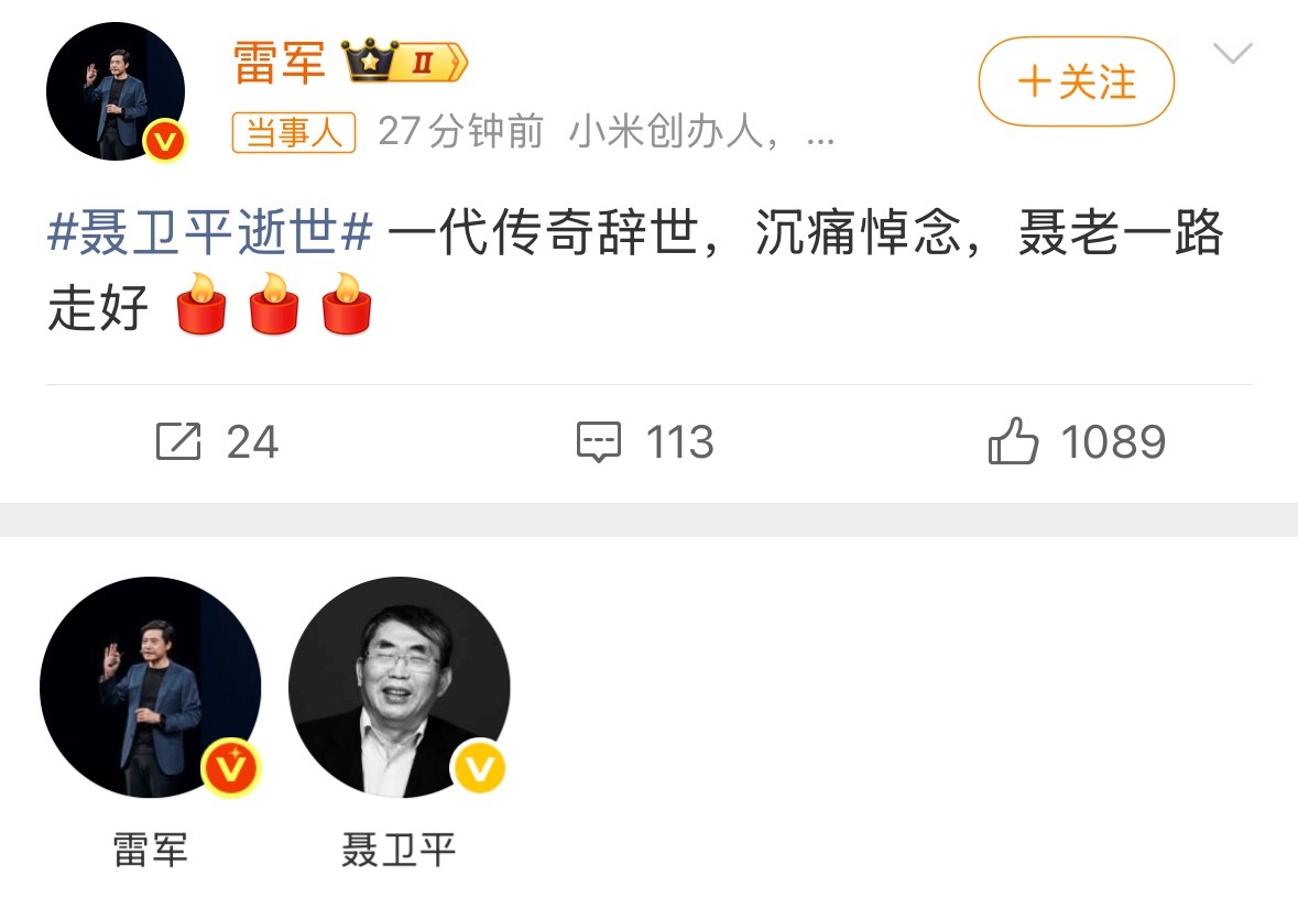 雷军悼念聂卫平 雷军发文沉痛悼念聂卫平,一句“一代传奇辞世”满含敬意。作为资深围棋爱好者,雷军年少时便崇拜棋圣聂卫平,曾坦言受其影响深,更有幸与偶像合影。聂卫平凭擂台赛传奇战绩掀起全民围棋热,获封“棋圣”,他的棋艺与精神影响几代人,雷军的悼念,亦是一位棋迷对偶像的深切缅怀。雷军