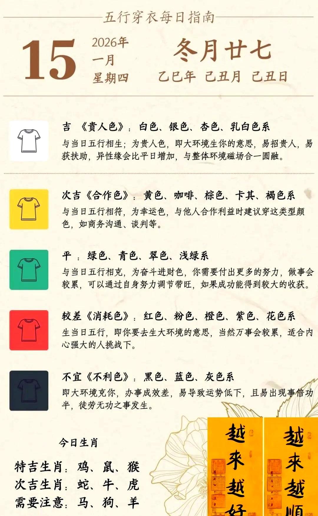 1月15号,己丑土日,土大哥当班。 想混得顺,就穿金戴银,白、银、金都行,土生金,贵人自动贴。 懒得折腾? 黄、咖、棕也行,同门兄弟好说话。 想挣钱就绿、青,得拼命。 红紫黑? 别给自己找累。 通勤白外套+米毛衣+咖裤,商务金西装+卡其裤,周末绿卫衣+蓝牛仔,全给你配好。 别忘了挂个金链子,土喂金,金再喂你,就这么简单。