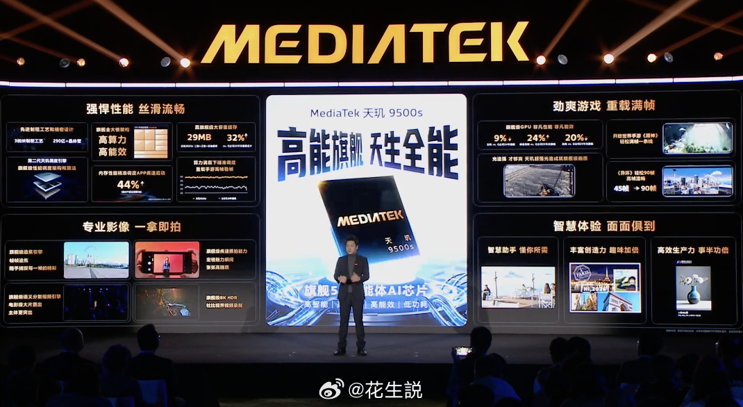 发哥又来了一款新SoC,这次叫天玑9500s,包含1颗3.73GHz的Cortex-X925 超大核,3颗Cortex-X4 跟4个Cortex-A720,发哥经典的全大核心设计,GPU是12CU的G925核心,搭配上台积电3nm工艺,性能还是很有看头的 这几年AI一直很火,天玑9500s集成了旗舰级的NPU,可以实现一系列端侧的AI照片编辑,Live Photo创作也不在话下,其他常用的AI功能也都有覆盖到 其他方面,天玑9500s支持8K全焦段杜比视界录像,以及出色的降噪和抓拍效果。总体来看,天玑9500s算是一款全副武装的SoC,大家可以期待一下新机