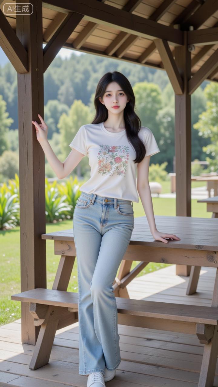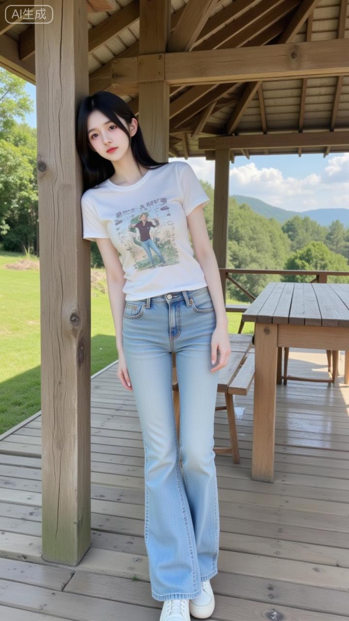 露台的松弛系少女 白印花T恤搭浅蓝微喇裤,清爽得像山间的风~靠在木柱旁的慵懒感,连远山绿植都成了她的日常滤镜✨ 是把“自然氛围感”焊在身上的妹妹!夏的小清新穿搭