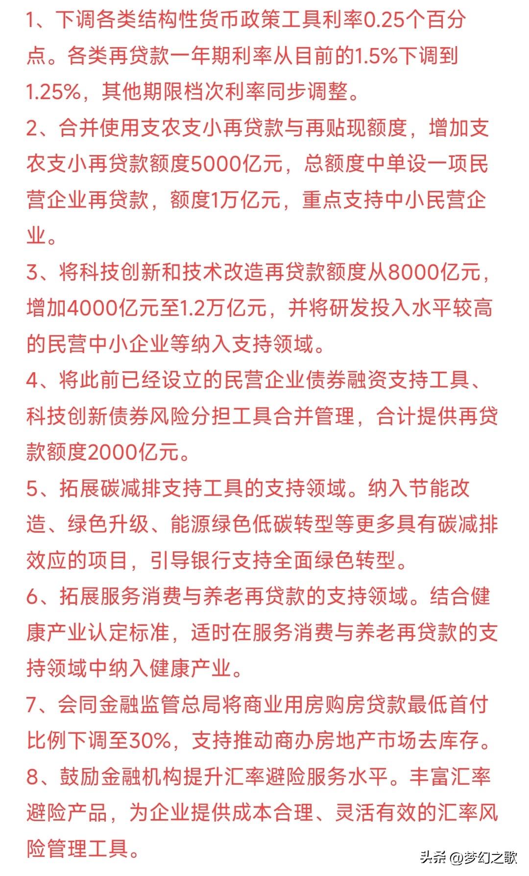 盘后,央行真金白银的开始下场支持实体经济和资本市场了 银行从央行借钱的利率少0.25个百分点,企业、农户后续贷款利息会更划算。 还专门设1万亿民营企业贷款额度,中小民企借钱更易、额度更足。 科技创新和技术改造贷款额度加4000亿(总1.2万亿),研发多的中小民企也能享受支持。 拿2000亿托底,科技类、民营类企业发债融资更有保障。 商业用房(比如商铺、写字楼)首付比例最低降到30%,帮商办地产去库存。 以上这些措施是实打实的支持中小企业发展,还有房地产的企稳,房地产以前出政策都是以居民住房为主,现在商业用房也出现了首付比例的下降。