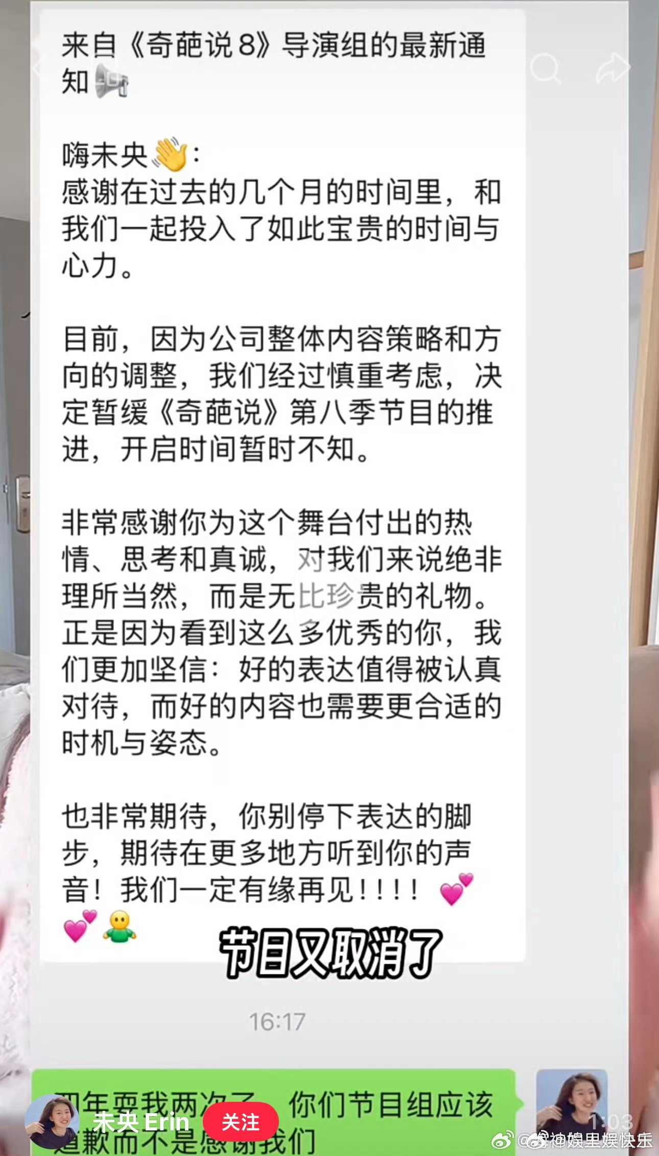 网友被奇葩说8四年耍了两次 心疼未央同学!21年参与奇葩说8海选两轮晋级线下,遇不可抗力节目搁置,获直通承诺,25年底项目重启遭无视,重赛晋级后又被通知取消,全程无歉意,四年努力全白费!