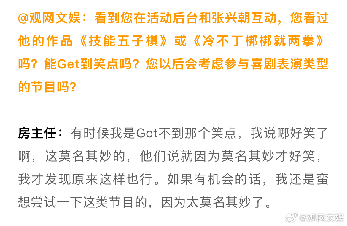 2025惊艳面孔房主任说想尝试喜剧表演 向表示,她开始看到《技能五子棋》这类作品时get不到笑点,觉得很莫名其妙,后来才理解了原来“莫名其妙”才是笑点,她表示有机会也想尝试这类的喜剧表演,“因为太莫名其妙了”。