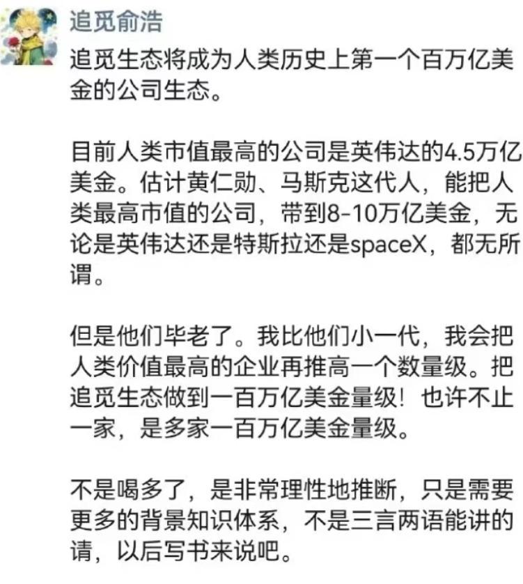 【追觅CEO被曝遭员工公开质疑!梦想可以有,但是到处“吹”就不对了!】日前,多家媒体爆料称,追觅科技 CEO 俞浩被员工公开质疑,认为其言论过激,不符合实际。 据悉,此前追觅创始人俞浩曾频出高调言论,并在社交媒体宣称“追觅生态将成为人类历史上第一个百万亿美金的公司生态”。尤其是近来在切入汽车赛道后,追觅相关争议言论更不罕见,频频出圈。 但是,笔者认为,梦想可以有,到处吹就不对了!尤其是在汽车这一注重实干和长期主义的赛道,光打雷不下雨是不行的,俞浩未收敛的激进风格,虽能吸引眼球,却可能加剧内外信任裂痕。企业逐梦需仰望星空,但更要立足主业筑牢根基,否则再宏大的蓝图也难以落地。你们觉得呢?【来自懂车帝车友圈】
