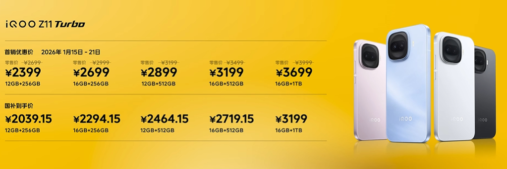 又一台中屏旗舰来了,iQOO Z11 Turbo~战斗精灵iQOOZ11Turbo来了 6.59英寸黄金中屏,配合大R角,手感在线,有没有特别喜欢这个尺寸的金属中框,玻璃/玻纤的后盖,视觉四等边,加上阶梯式缓坡设计的Deco,质感也不错配置方面,第五代骁龙8+LPDDR5X Ultra+UFS4.1,还有自研电竞芯片Q2,配合大面积VC均热板。续航是7600mAh超薄蓝海大电池+100W超快闪充。而且影像部分依然有惊喜,两亿大底超级主摄,支持4倍无损变焦和40倍数码变焦!所以这次不光是性能,iQOO Z11 Turbo把外观质感和影像体验也往上突破,加上橘子6,综合实力很强当然还有最关键的价格:12GB+256GB 首销优惠价2399元;16GB+256GB 首销优惠价2699元;12GB+512GB 首销优惠价2899元;16GB+512GB 首销优惠价3199元;16GB+1TB 首销优惠价3699元。国补后:12GB+256GB 国补到手价2039.15元;16GB+256GB 国补到手价2294.15元;12GB+512GB 国补到手价2464.15元;16GB+512GB 国补到手价2719.15元;16GB+1TB 国补到手价3199元。大家觉得香不香iQOO Z11 Turbo