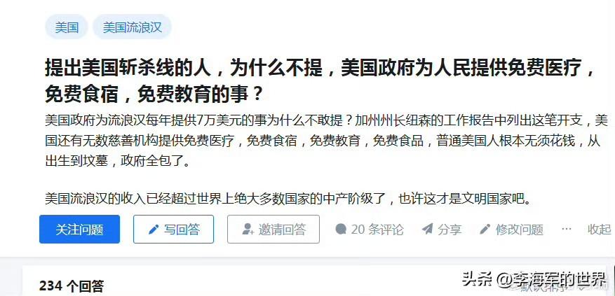 你们真的很无聊。 总是提美国的斩杀线,为什么不提美国的免费教育,免费食宿、免费医疗? 人家美国流浪汉,每年从政府能拿到7万美元救助,超过世界绝大多数国家的中产阶级。 普通美国人生活也不愁,教育、医疗、住宿,甚至连食品都有免费提供,人家从出生到坟墓,政府全包了。 一时你都分不清,这是真土殖,还是真钓鱼? 个人认为这应该是真钓鱼,而不是真土殖。 2026年了,现在这套话术已经糊弄不了中国人了,起码99%的国人不会相信这鬼话。 现在是互联网时代,不用你走出家门,只要你手指动动,你就能搜索到这个世界的大部分事实真相。 某书上对账已一年多了。 大量的美国人现身说法,如果你连他们的说辞都不信,那只能说你脑袋被门夹了。但凡心态正常一点都能分辨出这些美国人说的是真是假。 更不用说甜甜圈已经亲身体验了你口中美国所谓的“免费医疗”,问你几句话,10多分钟,账单几千美元。 免费食品,这个倒是真。 不过这个跟美国政府没多大关系,这个免费食品提供大多都是由当地社区救助站以及企业爱心人士联合提供的。但这个有地域和时间限制,你必须在规定的时间到指定的地方,才能领到这些食品。(这方面,金牌讲师是行家) 免费教育,这个指的是公立教育,美国的公立教育确实是免费。 问题是,既然公立教育是免费,那大家为啥还贷款上私立教育? 你不觉得这矛盾吗?有免费的不上,非要贷款上私立学校?