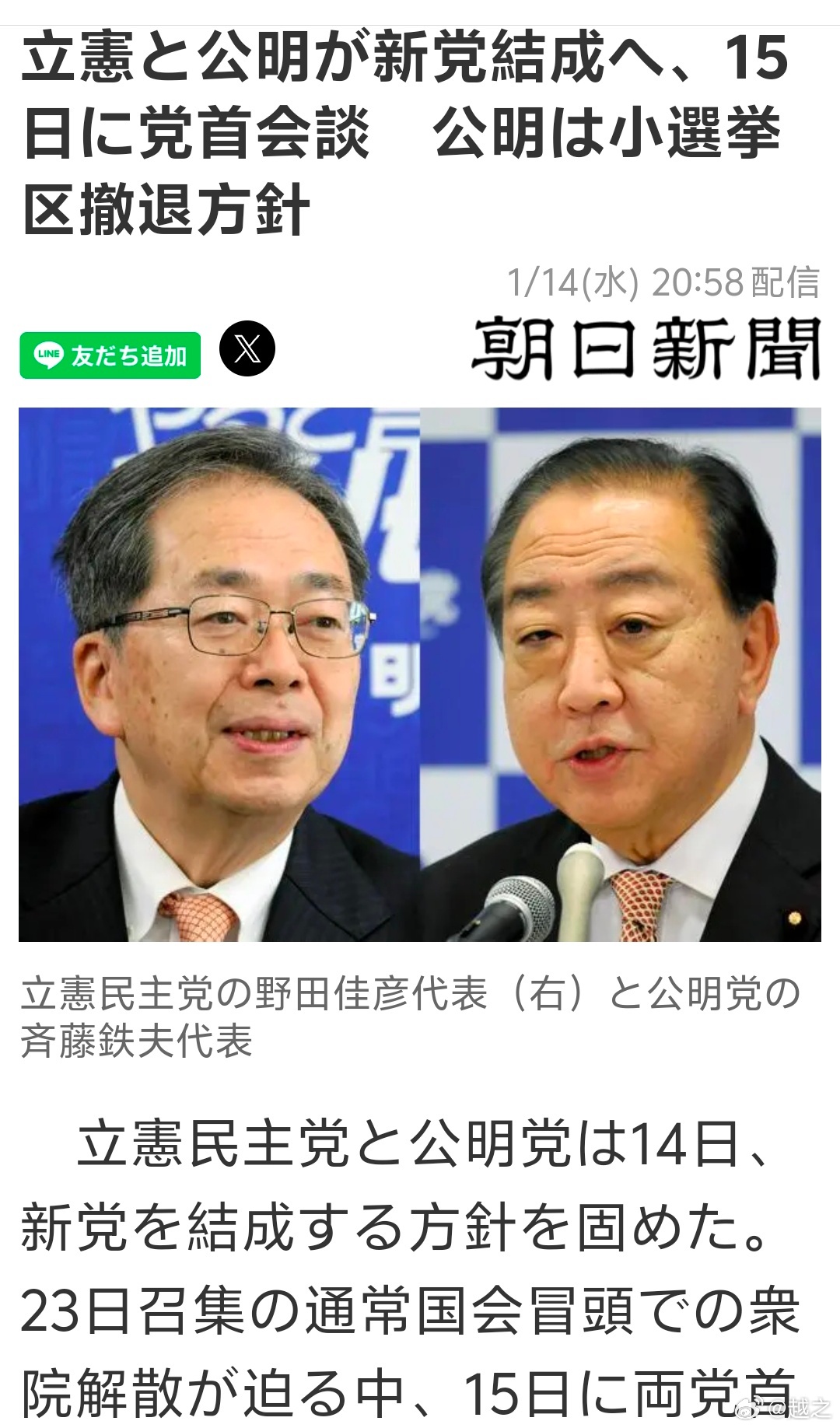 有意思,立宪民主党和公明党组建新党一起参选,反高市早苗派合体了。
