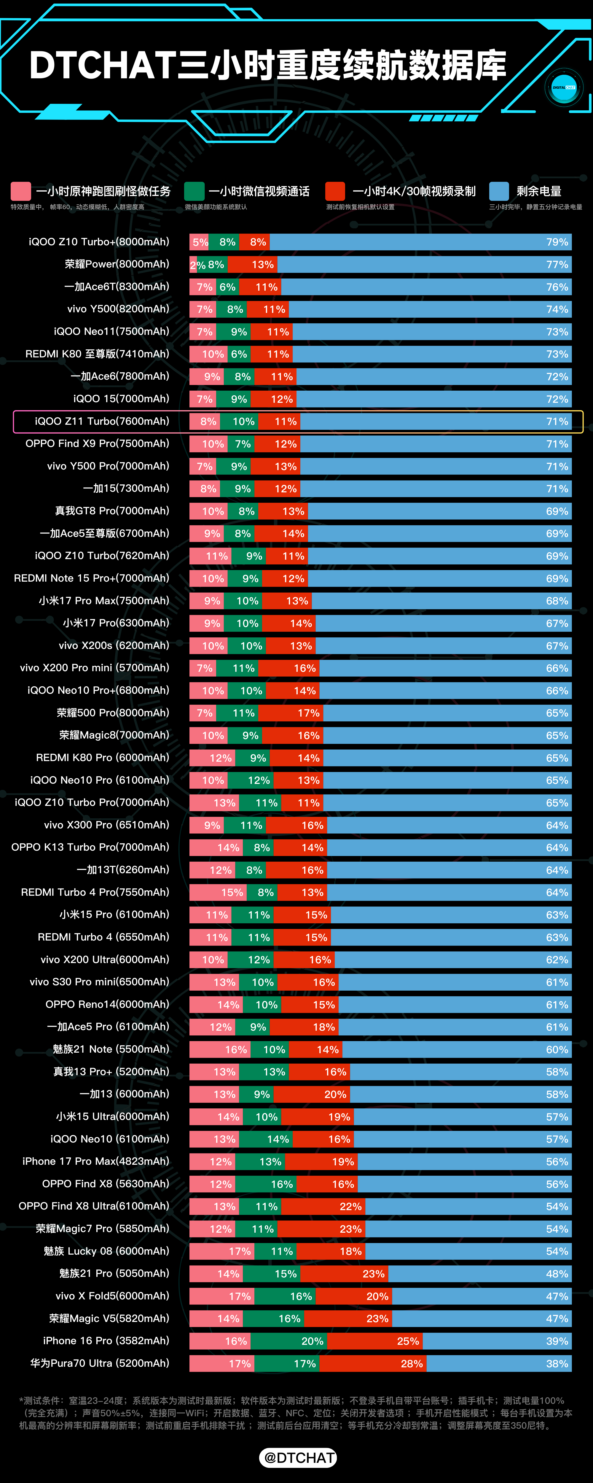 DTCHAT数据库 测试了一下iQOO Z11 Turbo的续航性能,在DTCHAT三小时重度续航测试下最后剩余电量71%,这个续航确实挺给力的,7600mAh电池出门基本不用带充电宝了。