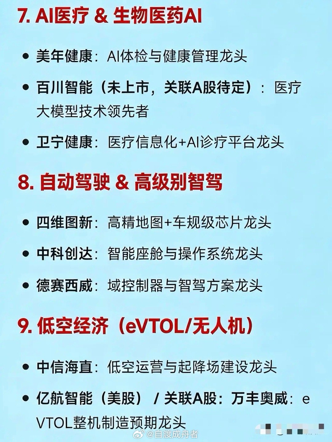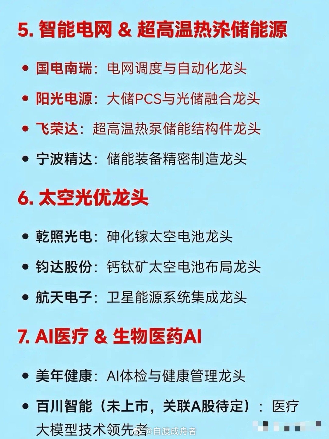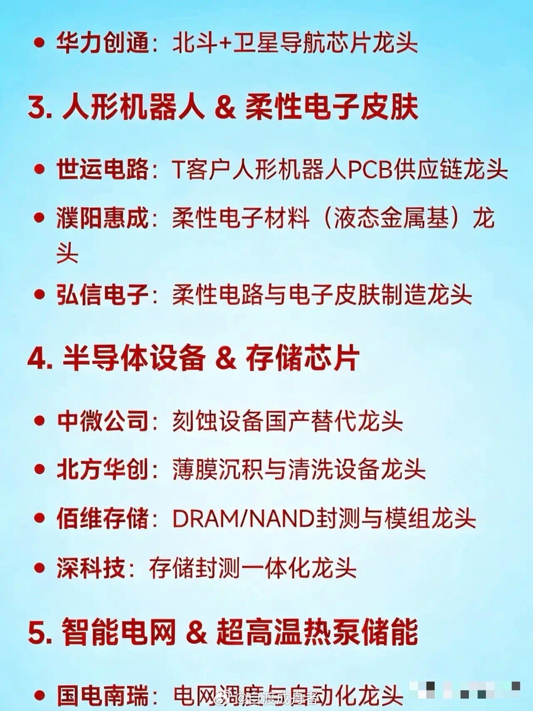 2026年1月15日十大热点科技及其产业链核心龙头1. AI应用(含智能体、办事AI):阿里系生态中,千问App核心合作龙头占据重要地位。中文在线与光云科技是AI内容生成与SaaS服务领域的龙头企业。利欧股份则为AI数字营销龙头,人民网是AI政务与内容审核方面的龙头。2. 商业航天 & 卫星互联网:中国卫星是低轨星座总体设计龙头。海格通信在卫星通信终端与测控领域占据龙头位置。银河电子为火箭发射配套电源系统龙头,华力创通是北斗+卫星导航芯片龙头。3. 人形机器人 & 柔性电子皮肤:世运电路是T客户人形机器人PCB供应链龙头。濮阳惠成是柔性电子材料(液态金属基)龙头,弘信电子则主导柔性电路与电子皮肤制造领域。4. 半导体设备 & 存储芯片:中微公司是刻蚀设备国产替代龙头。北方华创为薄膜沉积与清洗设备龙头,佰维存储是DRAM/NAND封测与模组龙头,深科技则是存储封测一体化龙头。5. 智能电网 & 超高温热泵储能:国电南瑞是电网调度与自动化龙头。阳光电源为大储PCS与光储融合龙头,飞荣达是超高温热泵储能结构件龙头,宁波精达是储能装备精密制造龙头。6. 太空光伏:乾照光电是砷化镓太空电池龙头。钧达股份为钙钛矿太空电池布局龙头,航天电子是卫星能源系统集成龙头。7. AI医疗 & 生物医药AI:美年健康是AI体检与健康管理龙头。百川智能虽未上市,但在医疗大模型技术方面处于领先地位,卫宁健康是医疗信息化+AI诊疗平台龙头。8. 自动驾驶 & 高级别智驾:四维图新是高精地图+车规级芯片龙头。中科创达为智能座舱与操作系统龙头,德赛西威是域控制器与智驾方案龙头。9. 低空经济(eVTOL/无人机):中信海直是低空运营与起降场建设龙头。亿航智能(美股)是eVTOL整机制造预期龙头,万丰奥威与之关联紧密,光启技术是超材料隐身与结构件龙头。10. 核能 & 核电设备(《原子能法》施行):中国核电是核电运营龙头。东方电气为核岛主设备制造龙头,兰石重装是核级压力容器制造龙头,中国一重是大型锻件与反应堆压力壳龙头。