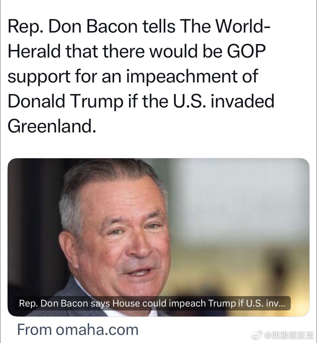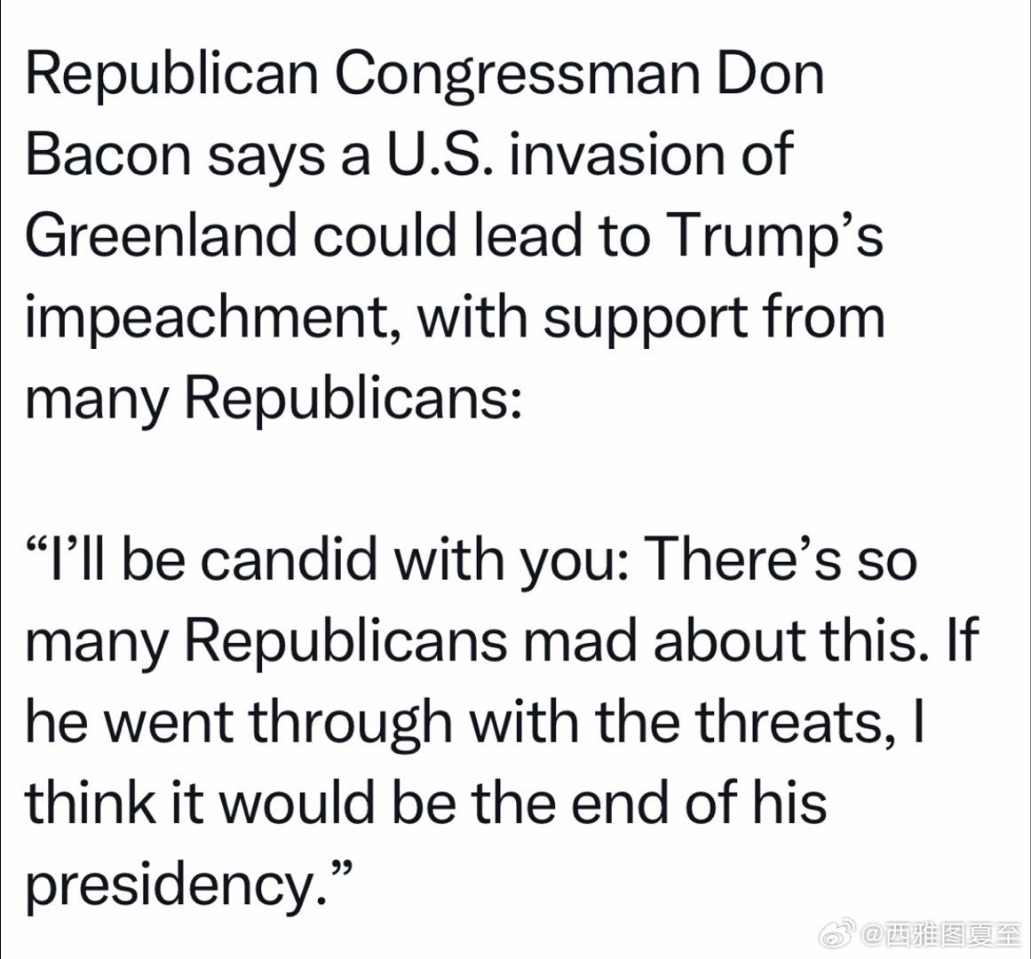 共和党众议员接受家乡报纸采访时称,如果总统真的武力入侵格陵兰,会有很多本党议员支持弹劾他…共和党政客对他威胁欧洲盟友感到非常愤怒
