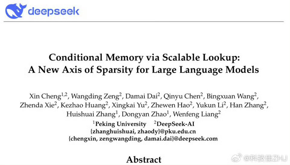 DeepSeek又整新活了!简而言之就是增加了Engram条件记忆机制,给MoE模型提速:把固定知识存成表省算力,训练量减18%还反超同参数模型,推理吞吐几乎没降。论文一作是北大在读博士,还在DeepSeek干活,新人这是挑大梁了啊DeepSeek又开源了
