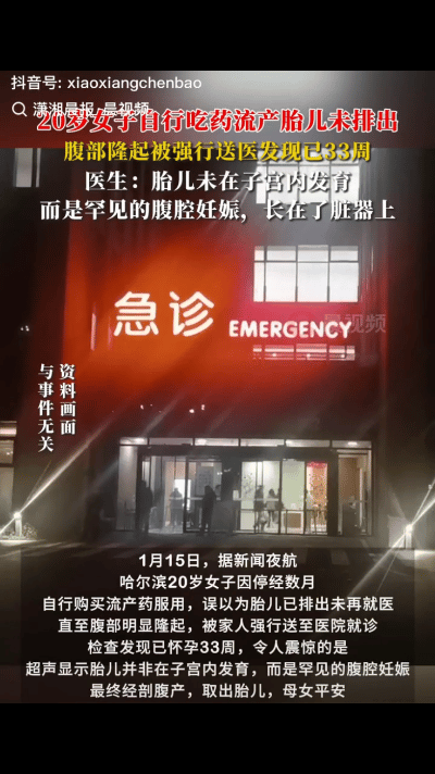 20岁女孩停经后买药流产, 肚子反常隆起被送医, 检查结果让医生都惊了。 哈市一医院最近收治了个20岁姑娘小暖。 她一开始以为只是月经不调,自己买了药物流产,吃了几天没啥反应就没管了。 结果肚子越长越大,朋友看不下去,硬拉她去医院。 一查吓一跳,孩子根本没在子宫里,是腹腔妊娠,已经33周了。 胎盘盖住宫颈口,没法顺产。 更危险的是她体重轻,还贫血,随时可能大出血。 医院连夜手术,像拆炸弹一样把孩子取出来。万幸母女都活了。 这种事太悬了,药流哪能自己乱来,差一点就出大事。好在最后人没事。 这件事就这么过去了。